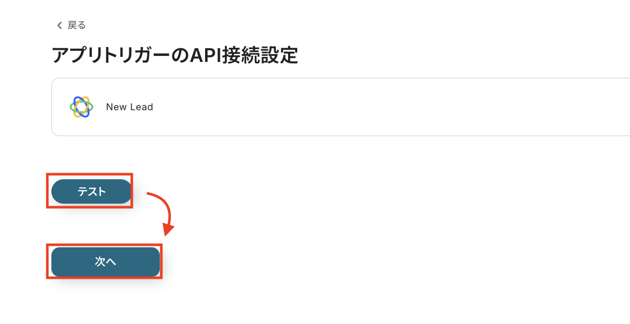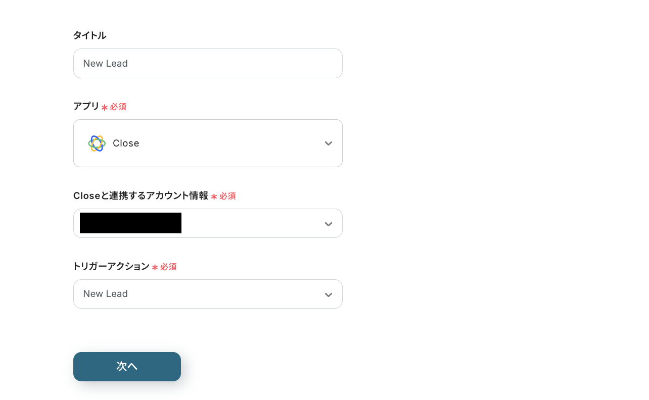 まずは、トリガーとなる「New Lead」をクリックして、連携するアカウント情報が入力されていることを確認して[次へ]をクリックしてください。