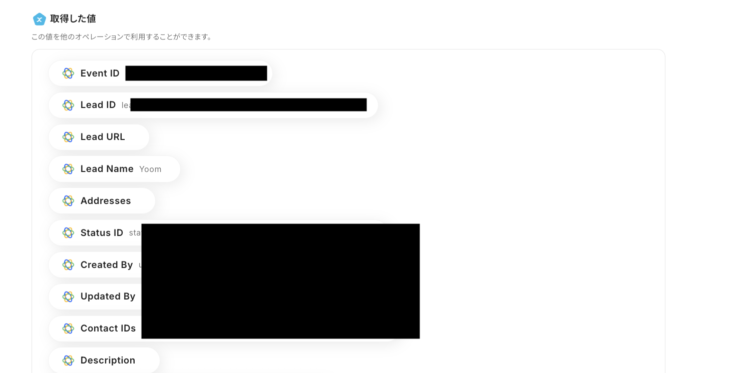 アウトプット情報は、「この値を他のオペレーションで利用することができます。」という注釈の通り、この後のステップで引用・活用できます。