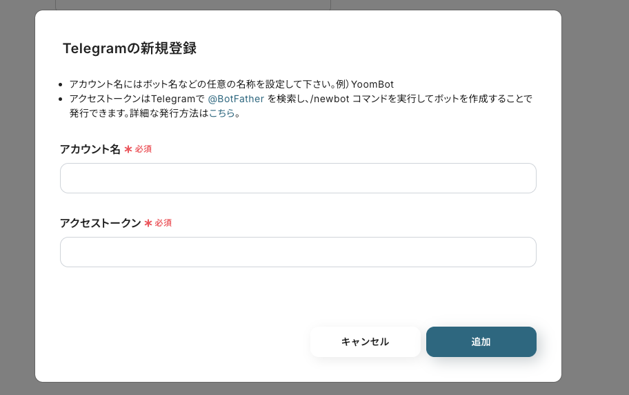 アクセストークンはTelegramで @BotFather を検索し、/newbot コマンドを実行してボットを作成することで発行できます。(詳細な発行方法はこちら。)