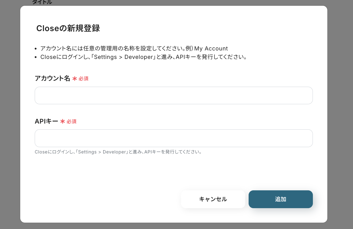 注釈に沿って「アカウント名」と「APIキー」を入力して、[追加]をクリックしてください。