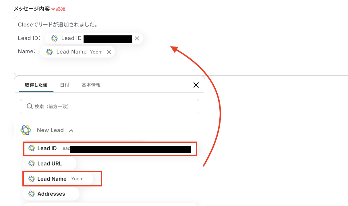 「メッセージ内容」では、入力バーをクリックすると、前ステップから取得した情報をアウトプットとして引用できます。今回は以下のように設定しました。