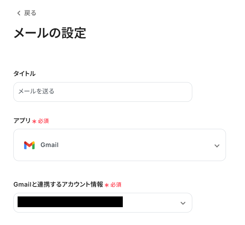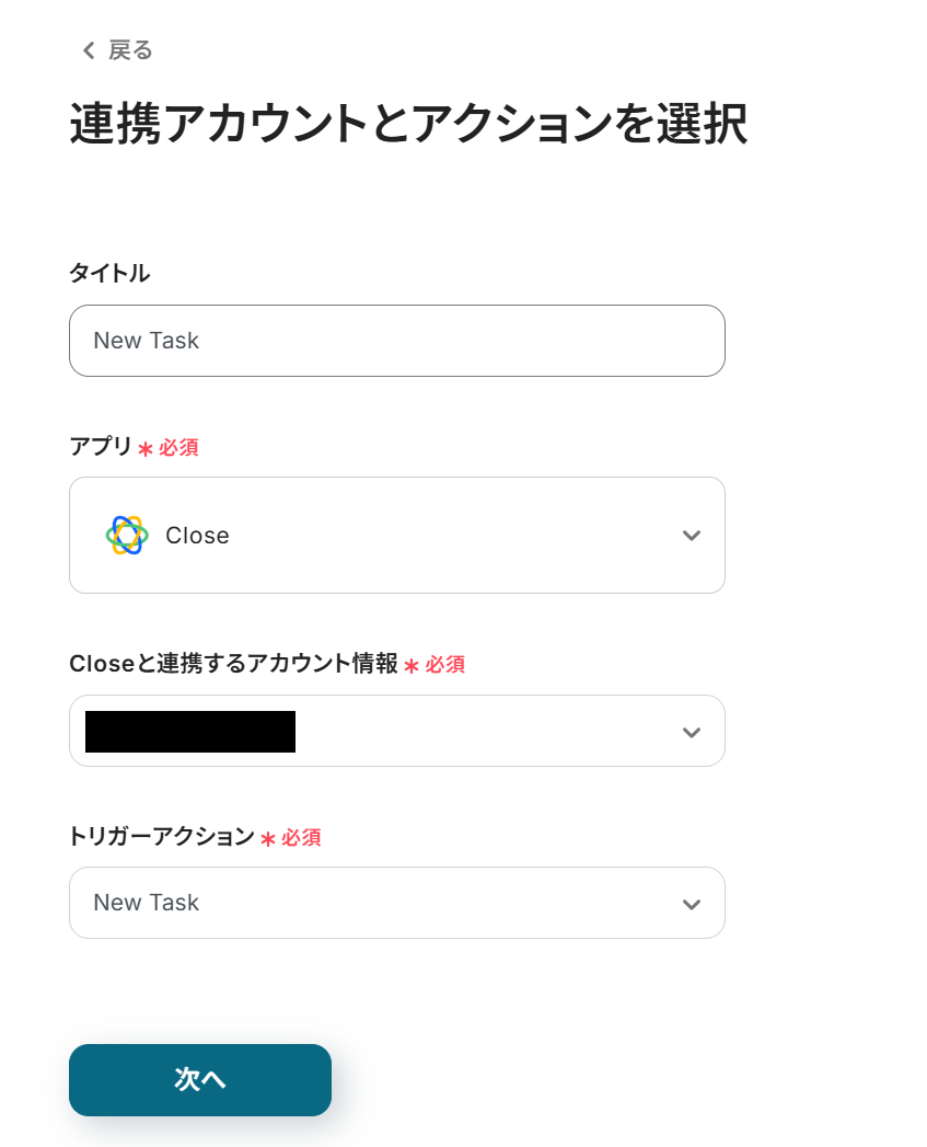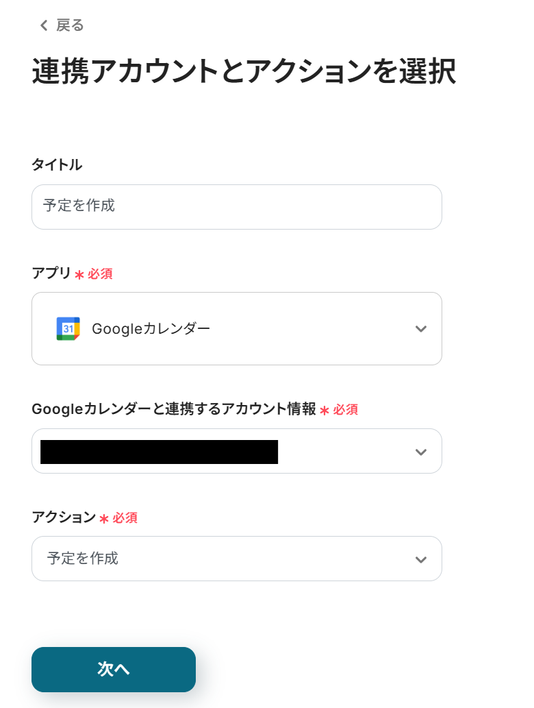 「連携アカウントとアクションを選択」画面では以下を設定します。