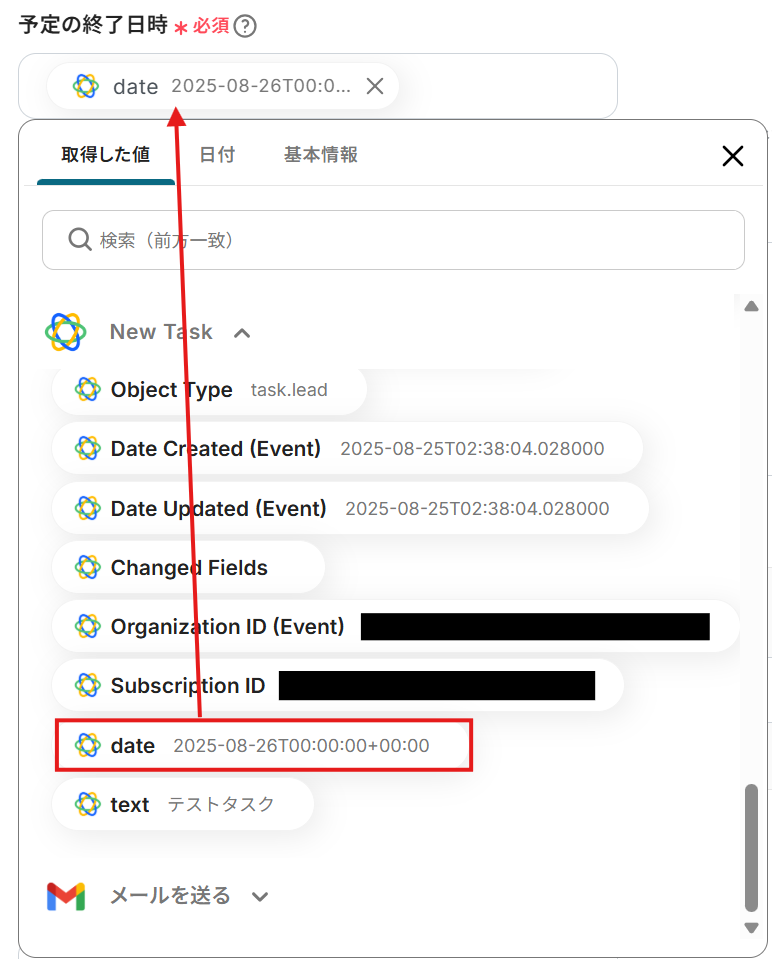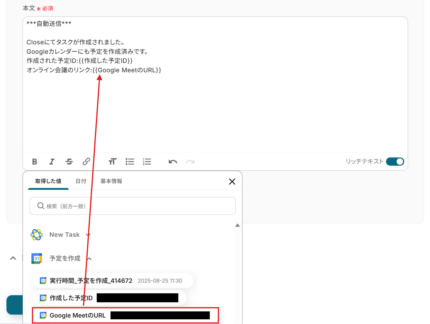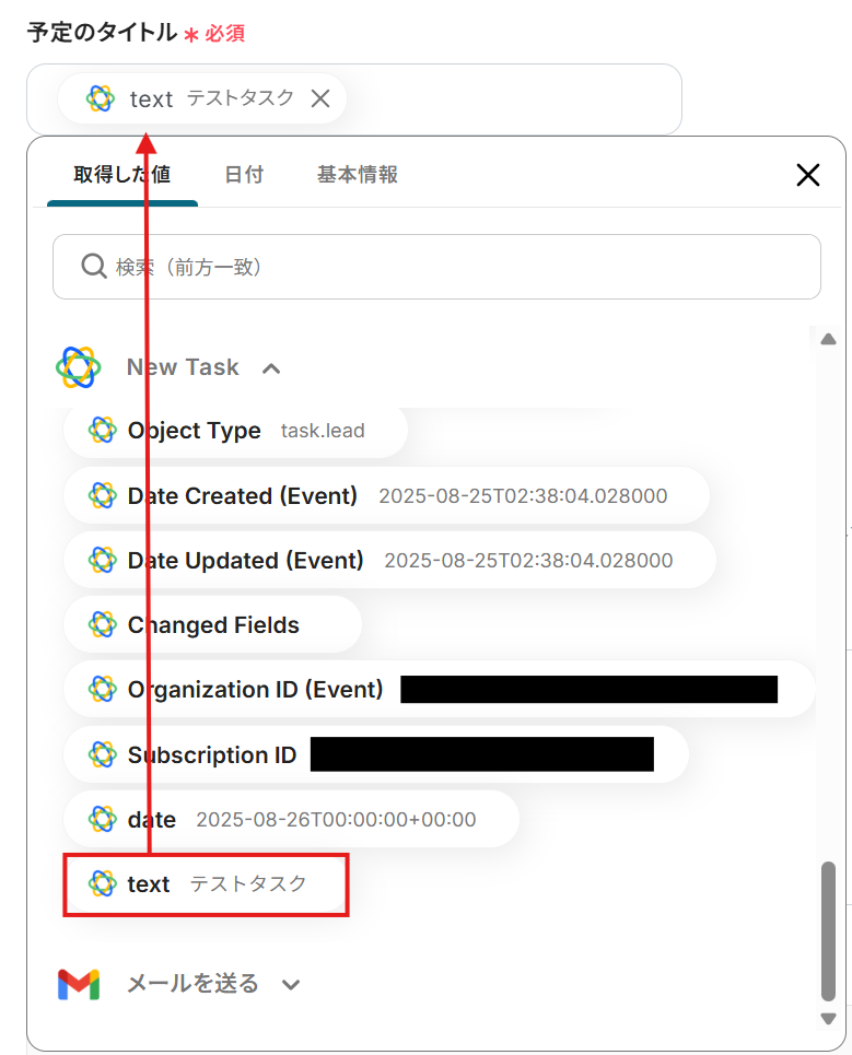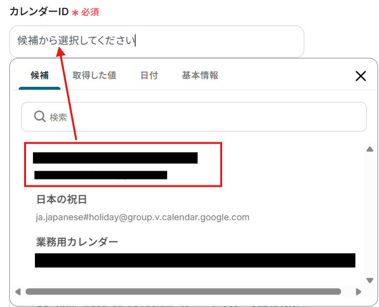 直接入力した固定値とあわせて、前のステップで取得した値についてもプルダウンより設定することが可能です。