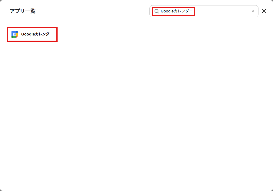 検索ボックスにGoogleカレンダーと入力し、Googleカレンダーのアイコンをクリックします。
