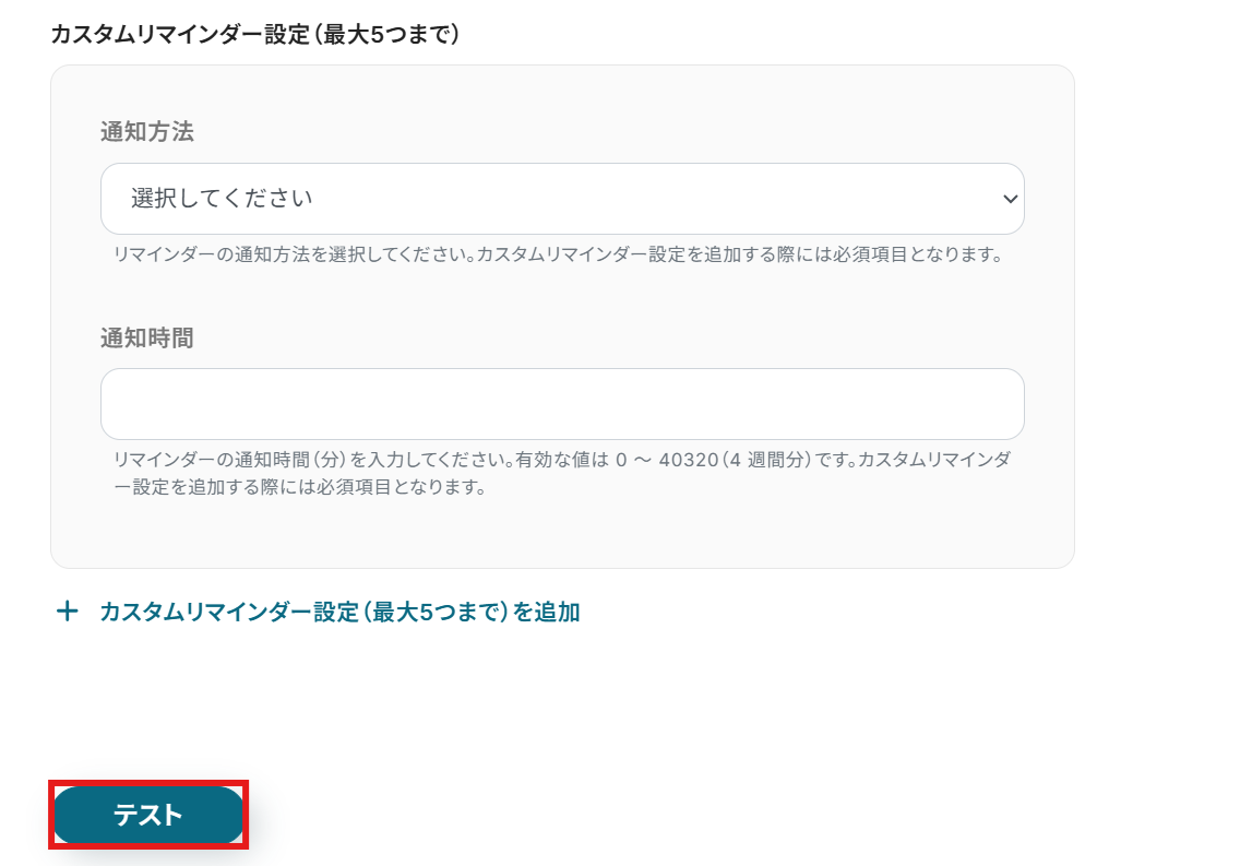 設定が完了したらテストボタンをクリックしましょう。(※実際にGoogleカレンダーに予定が作成されます)