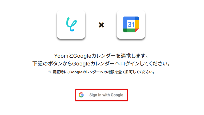 下記画面が表示されたら「Sign in with Google」のボタンをクリックし、Googleカレンダーと同様に設定してください。