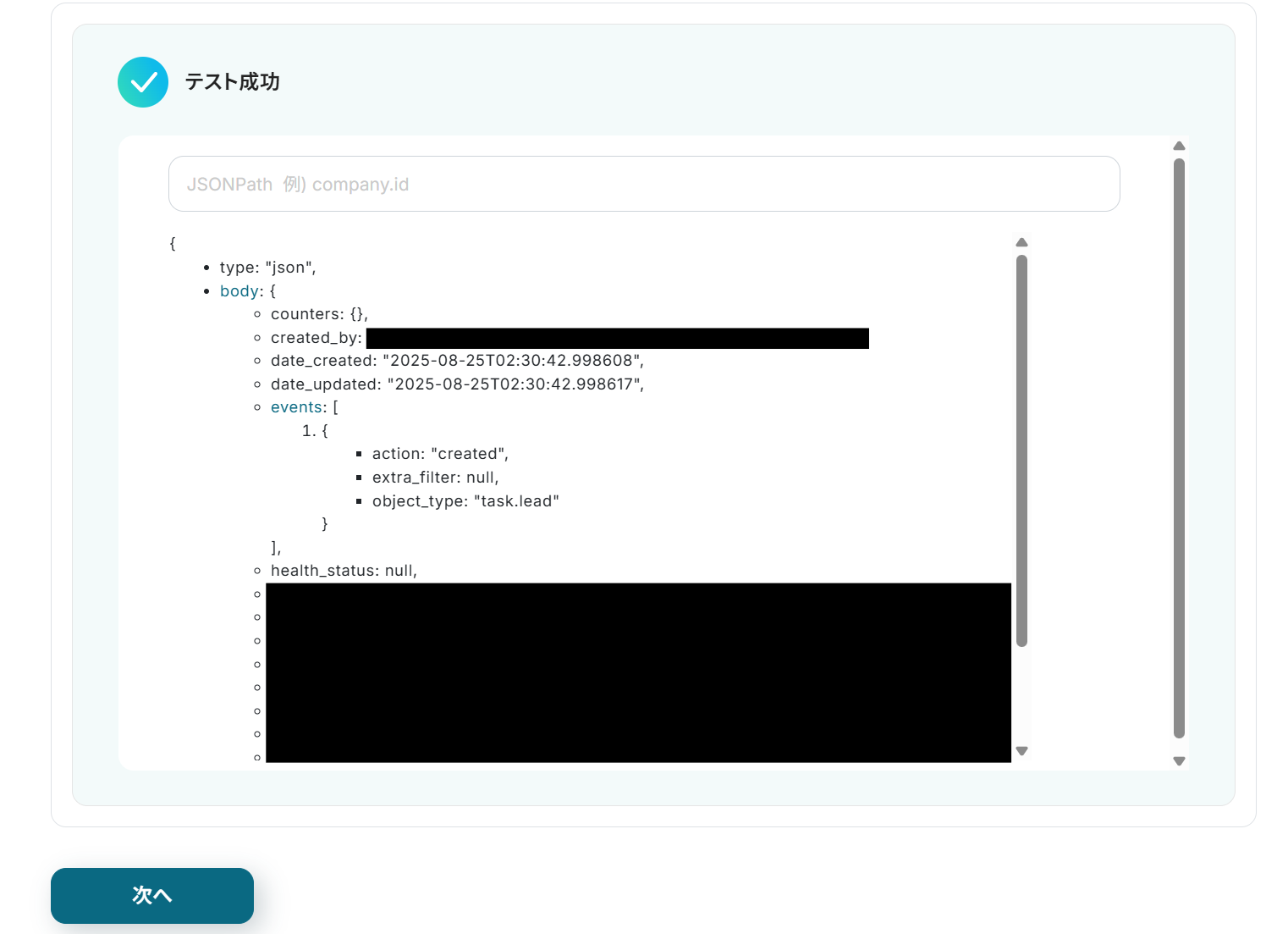 Closeで作成したタスクが問題なくYoom側で取得できていれば、テスト成功が表示されます。