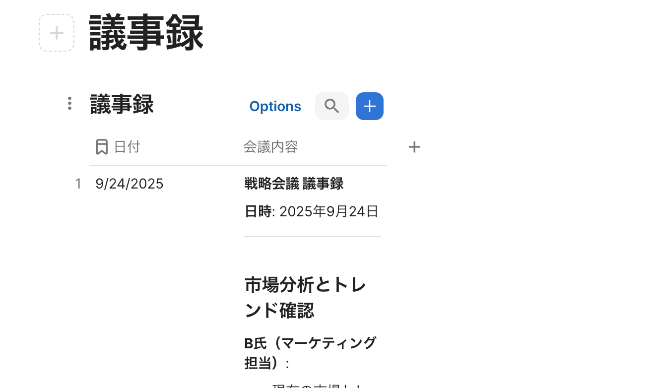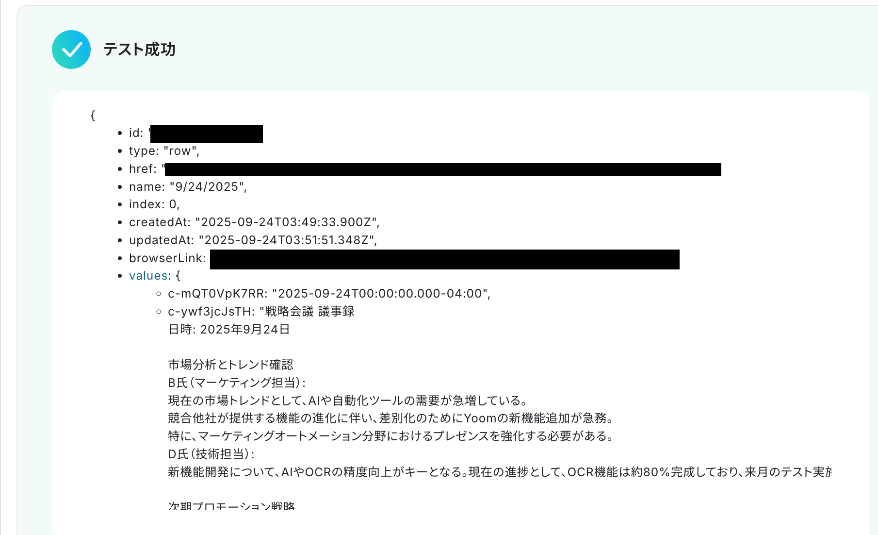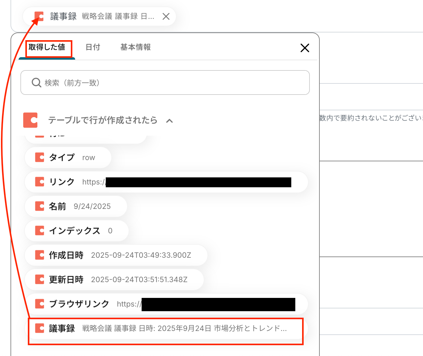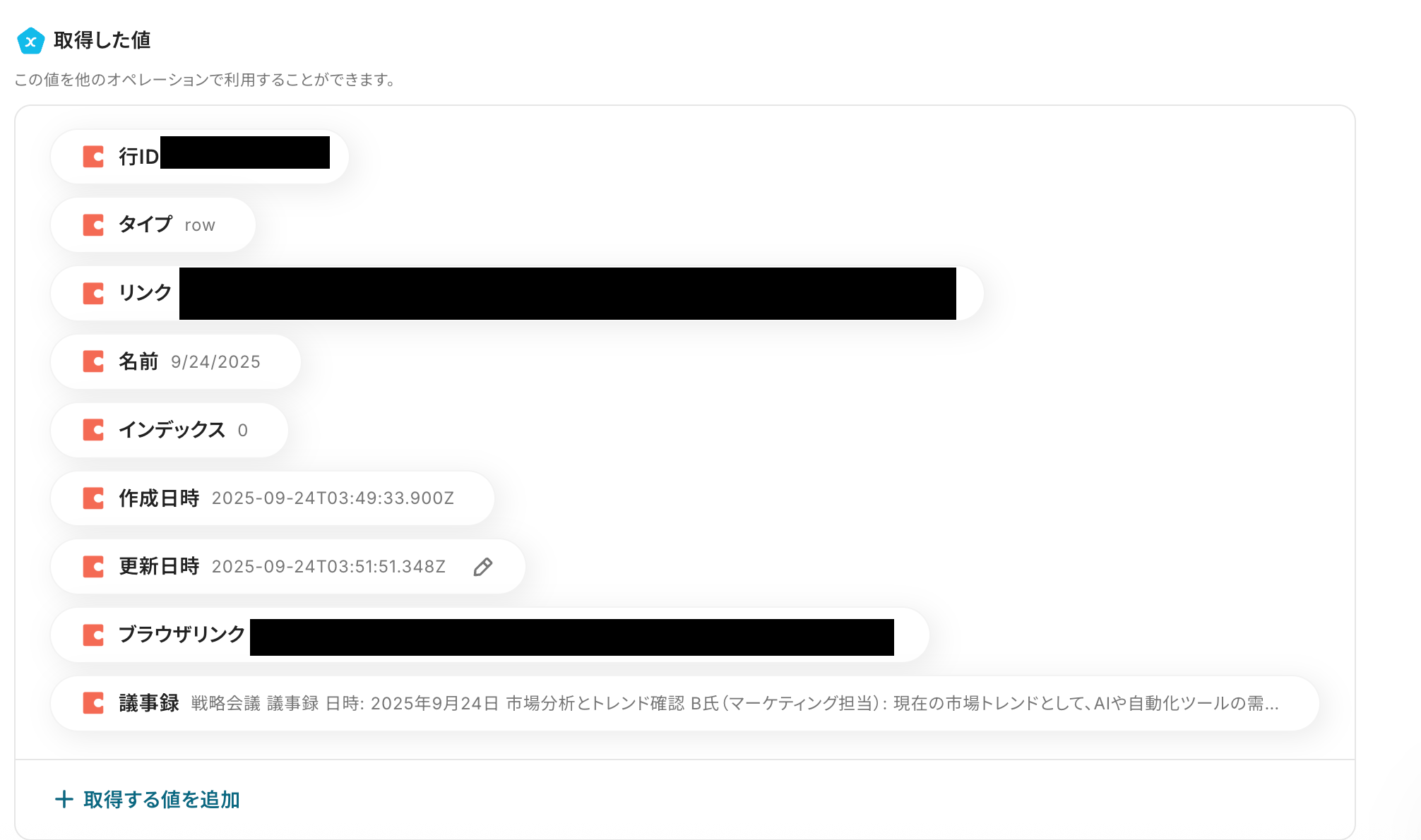 以下のように、「議事録」の内容が取得した値に追加できたら保存しましょう。