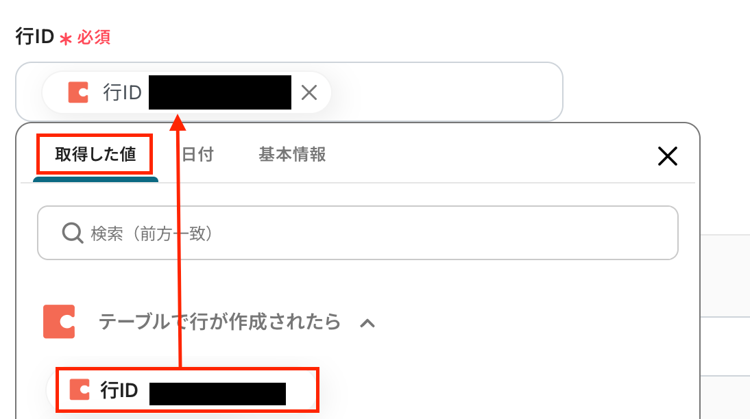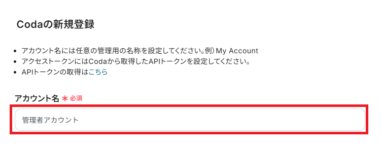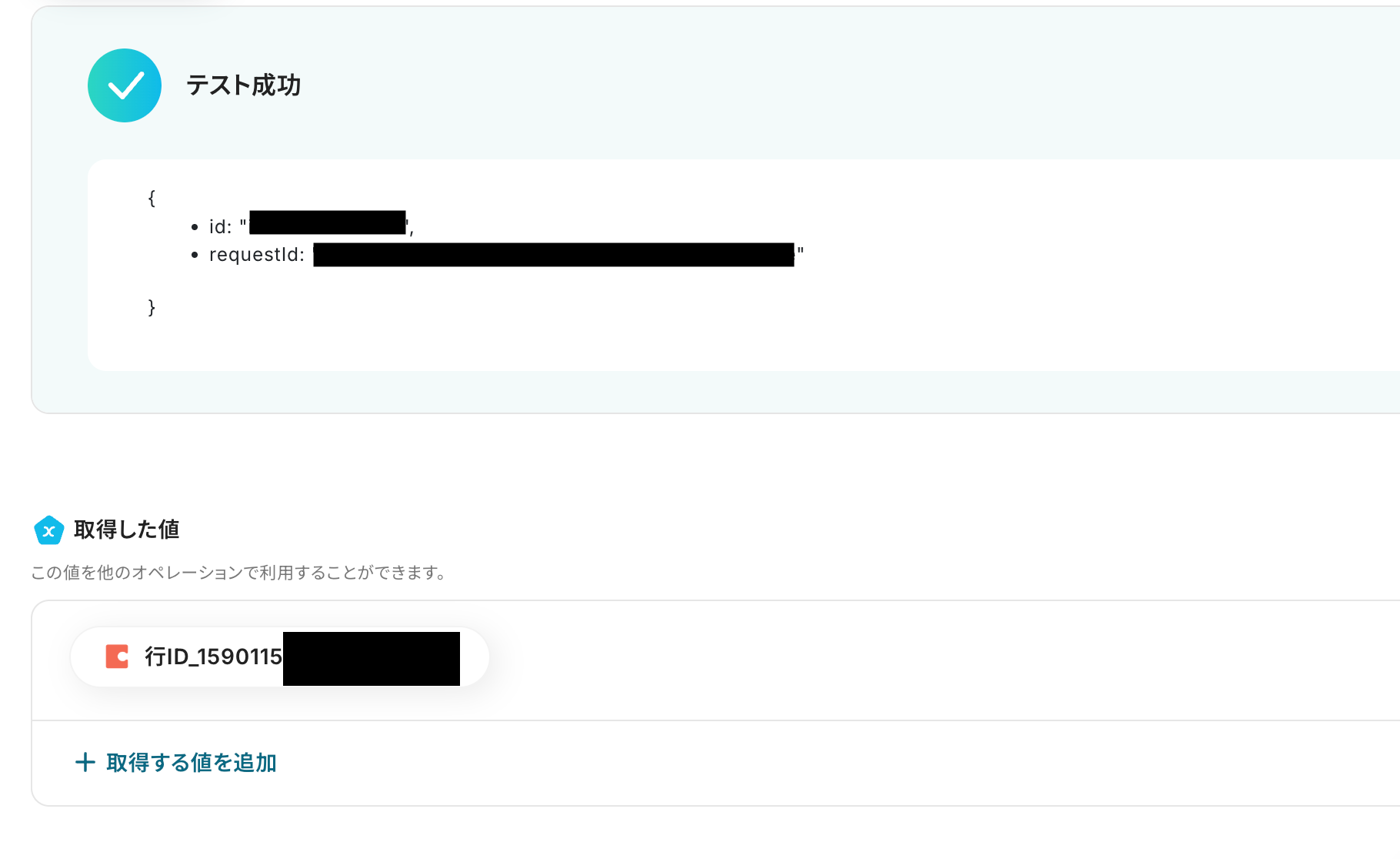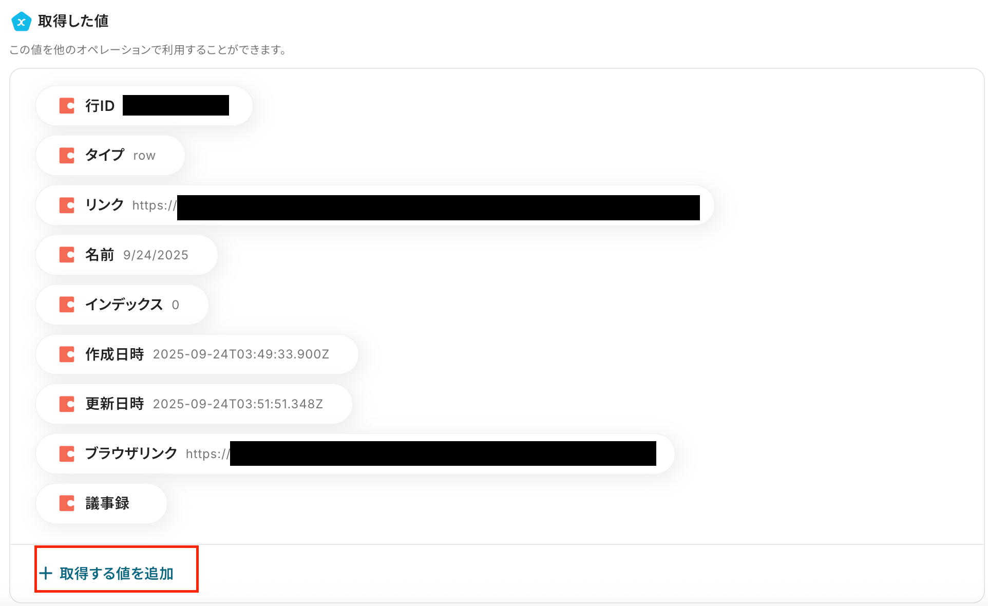 「取得した値を追加」をクリックして、Codaの情報を手動で追加する必要があります。