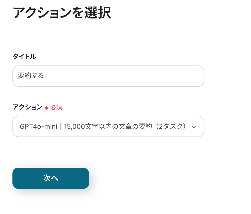- アクションは「15,000文字以内の文章を要約」が選択されています。