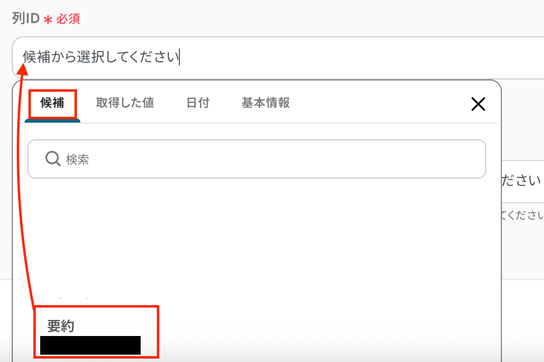 列IDは候補に表示される中から、「要約結果」を追加したい列名を選択しましょう。