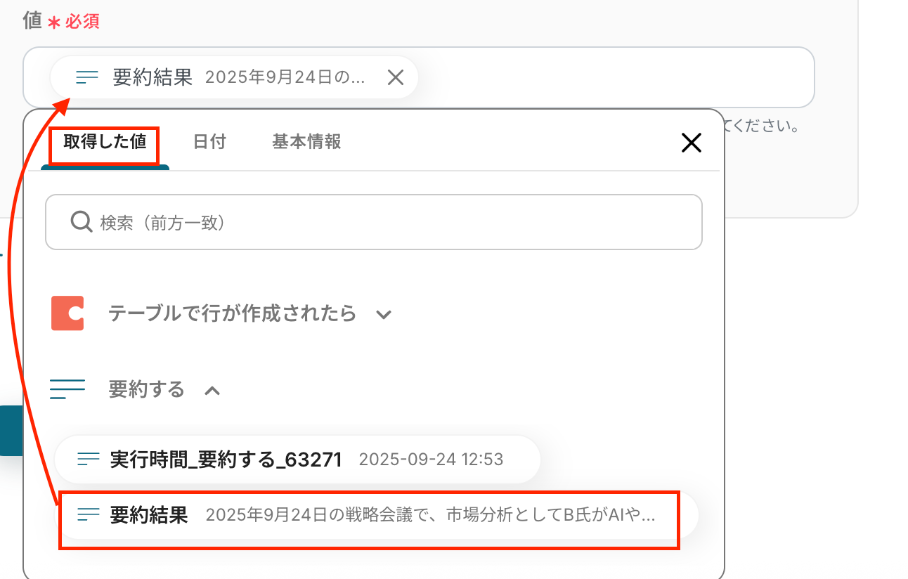 値は要約するで取得した値から「要約結果」を選択しましょう。