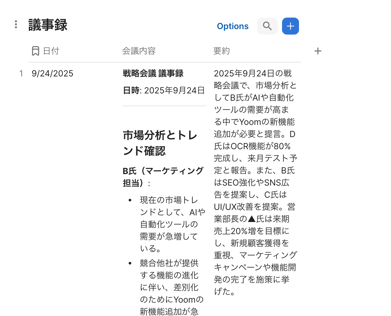 Codaに議事録やレポートなどの長文テキストが追加された際に、AIがその内容を自動で要約し、指定されたレコードを更新することで、手作業での要約作成の手間を減らすことができます。