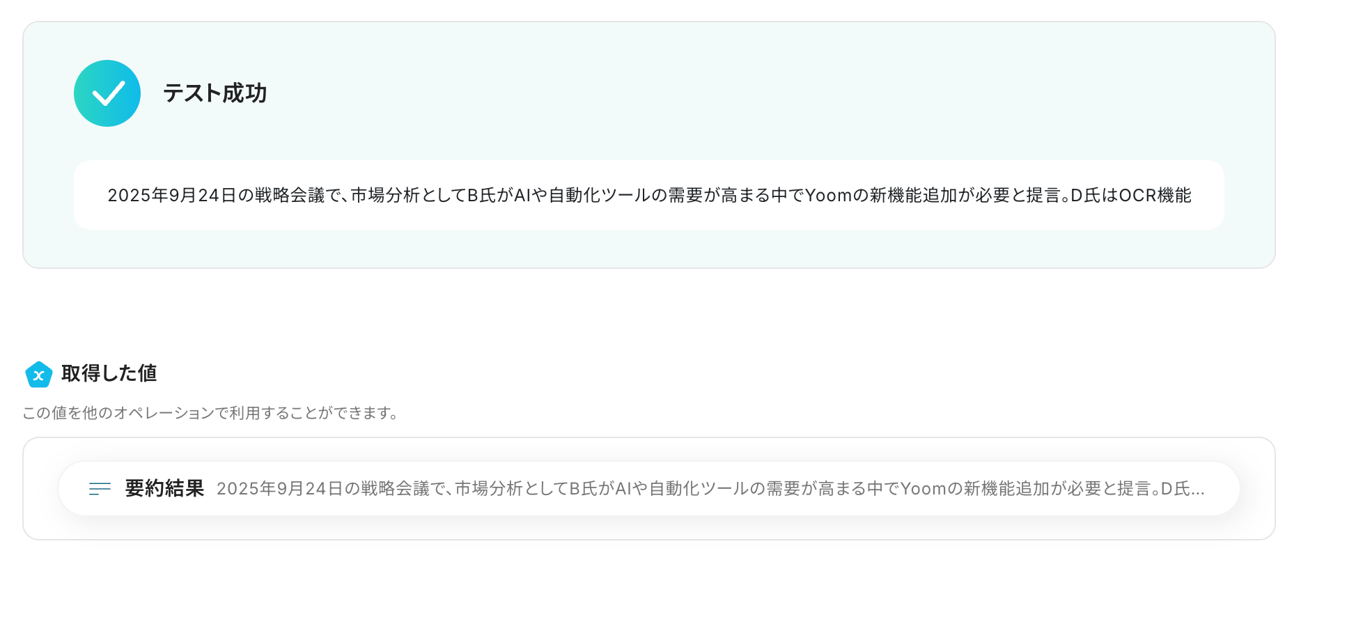 例えば、「議事録からタスクを抽出」と入力すると、議事録からタスクを抽出したテスト結果が表示されます。