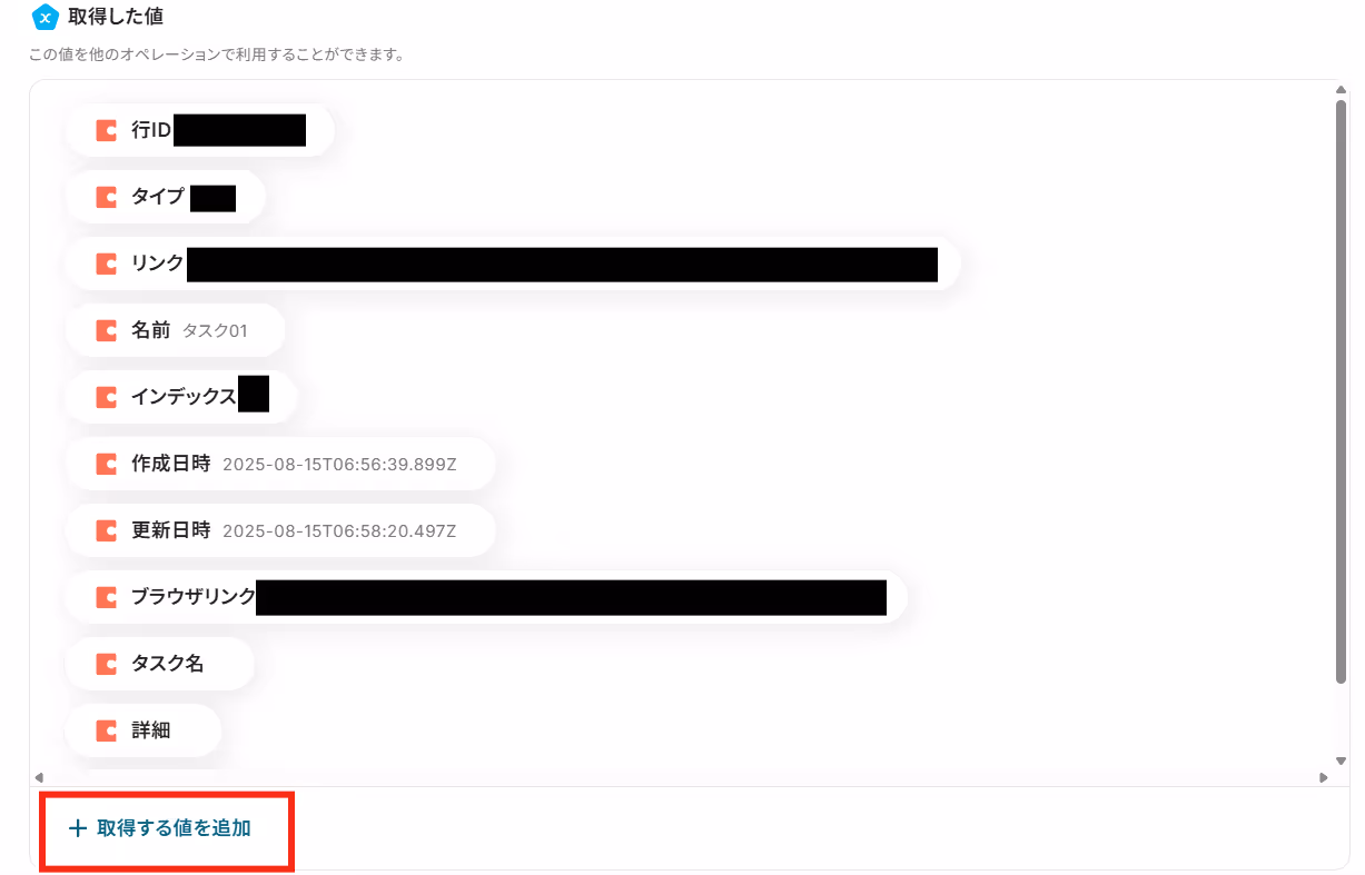 「取得した値」(アウトプット)について、詳しくはこちらをご覧ください。