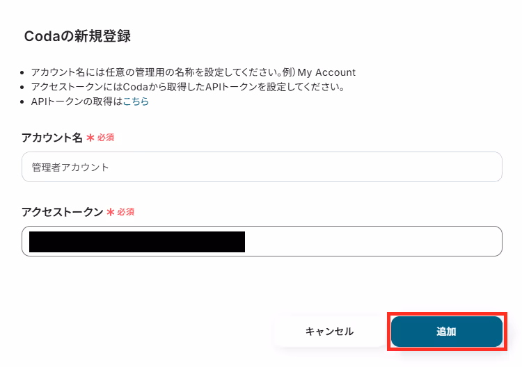 Yoomに戻り、コピーしたAPIトークンを貼り付け最後に「追加」をクリックします。