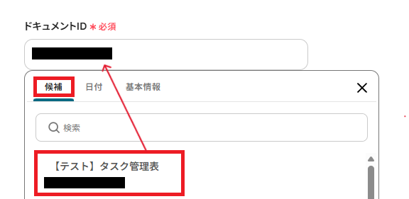 「ドキュメントID」は、候補から連携したアカウント内にあるドキュメントを選択してください。