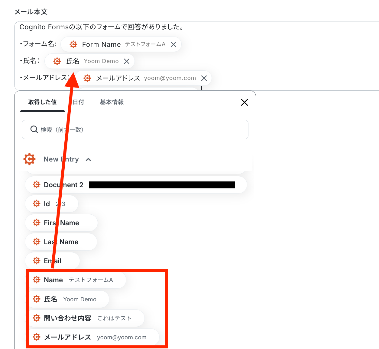 - Cognito Formsの値を取得する方法は「「取得する値」を追加する方法」を参照ください。