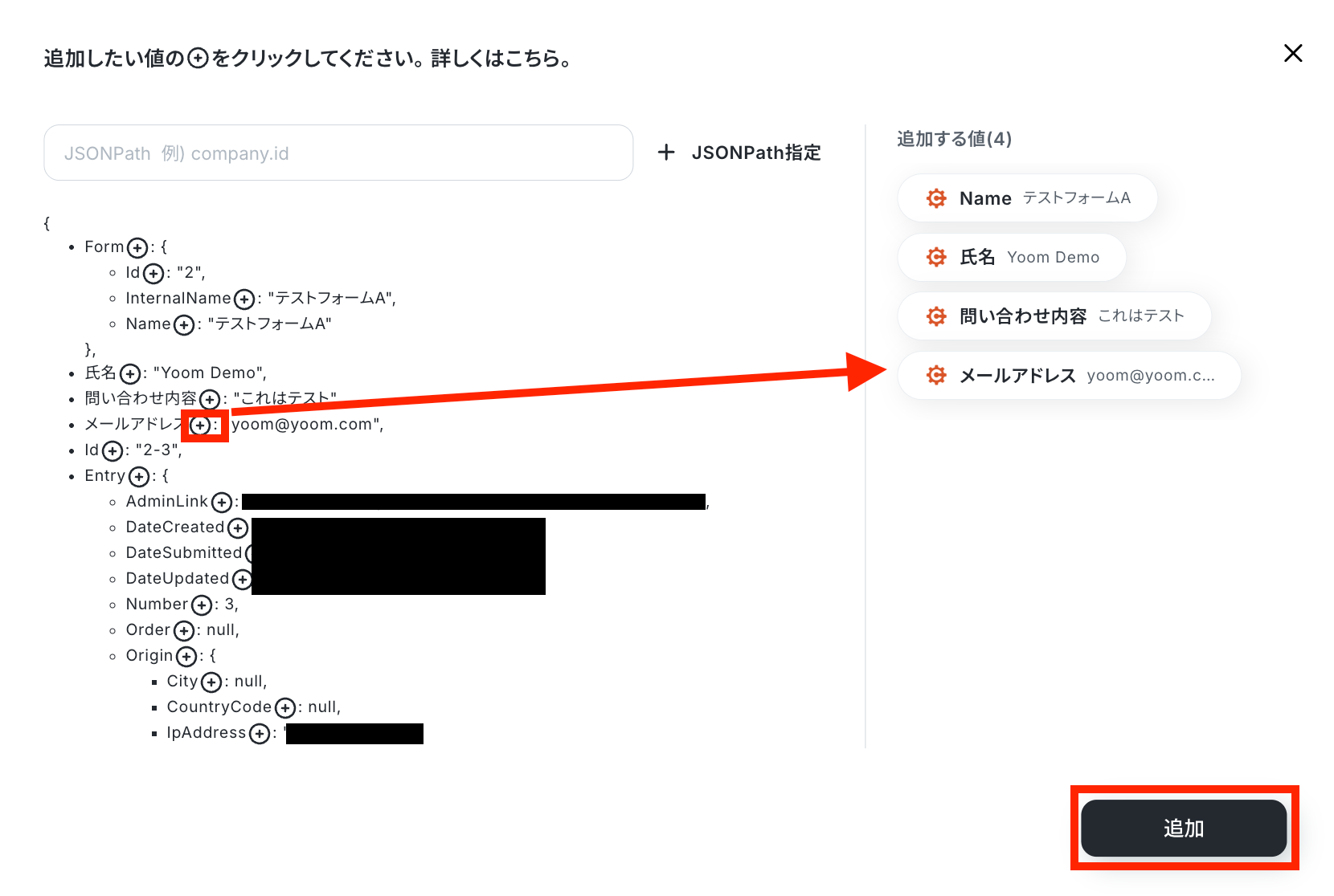 追加したい項目の右にあるプラスマークをクリックして追加する値を選択し、「追加」ボタンを押します。