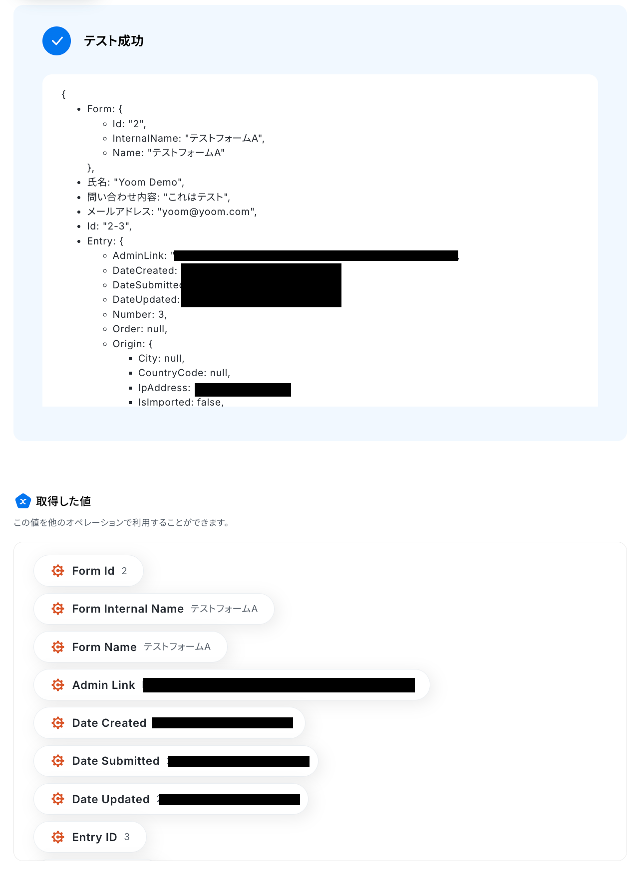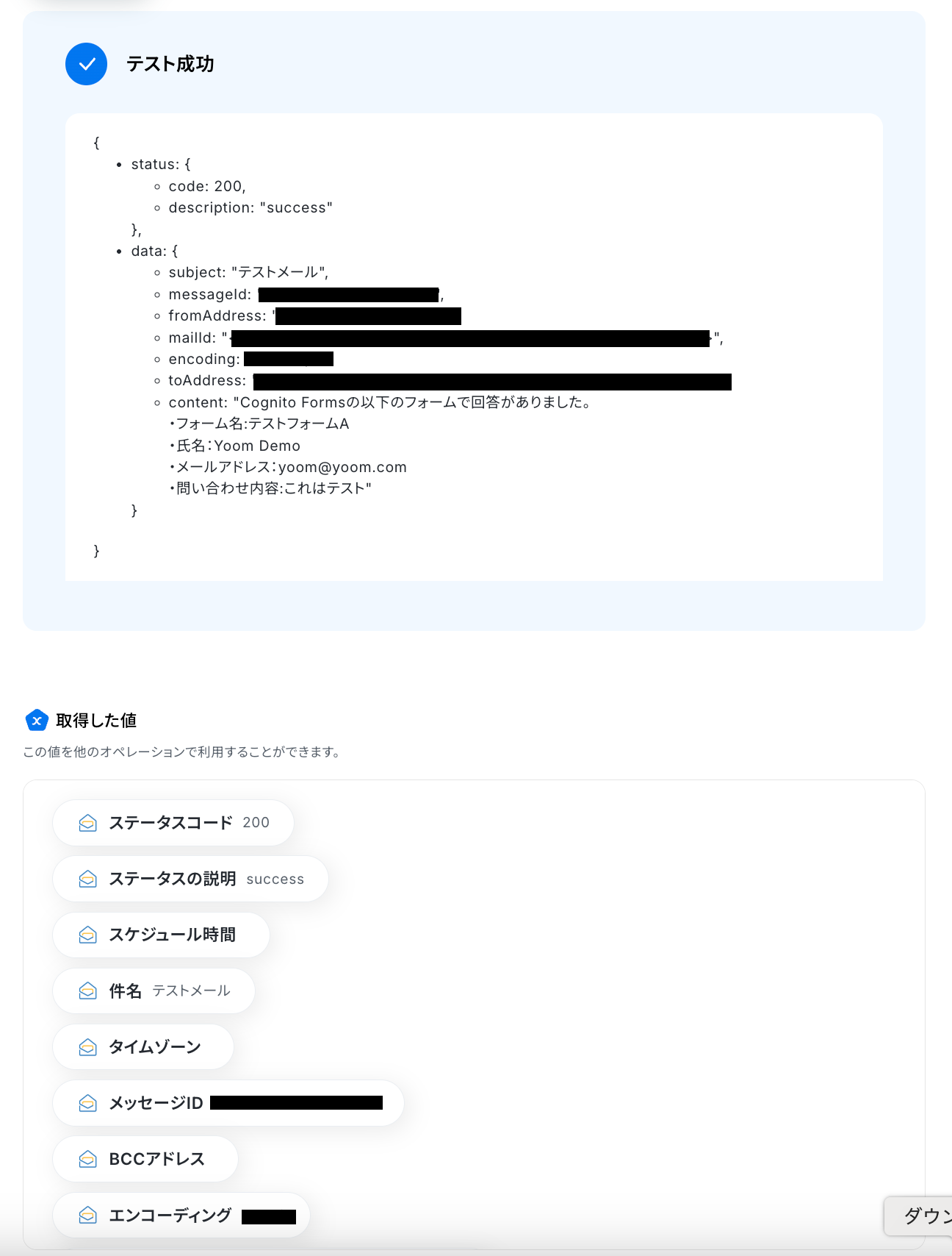 テスト成功で、取得した値が取得されます。