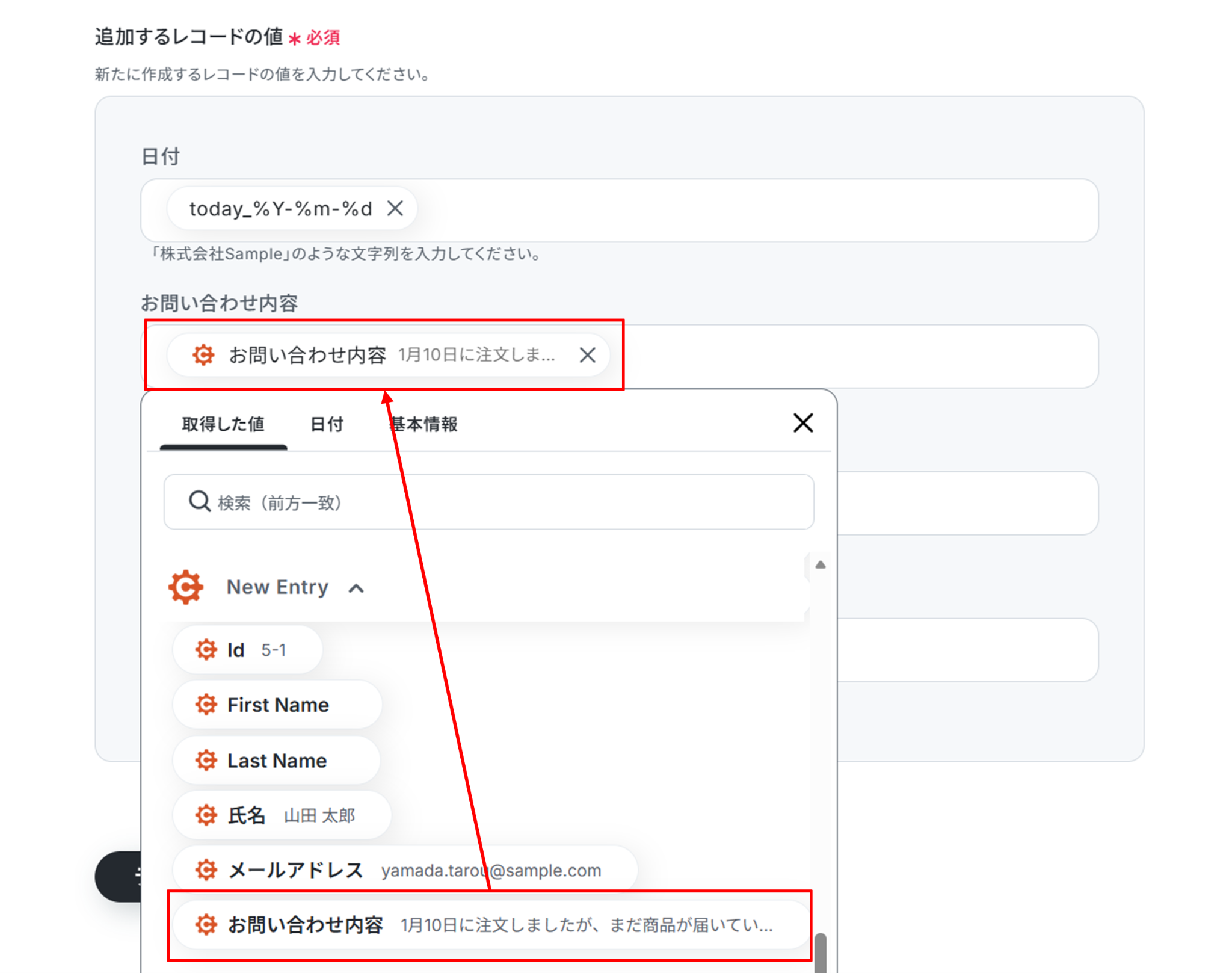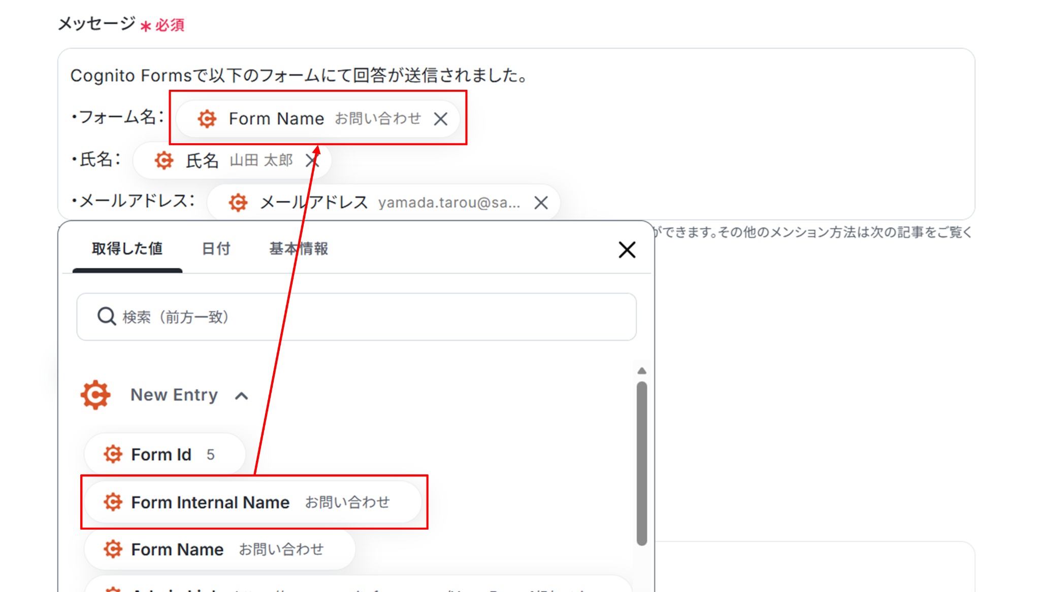 - Cognito Formsの値を取得する方法は「「取得する値」を追加する方法」を参照ください。