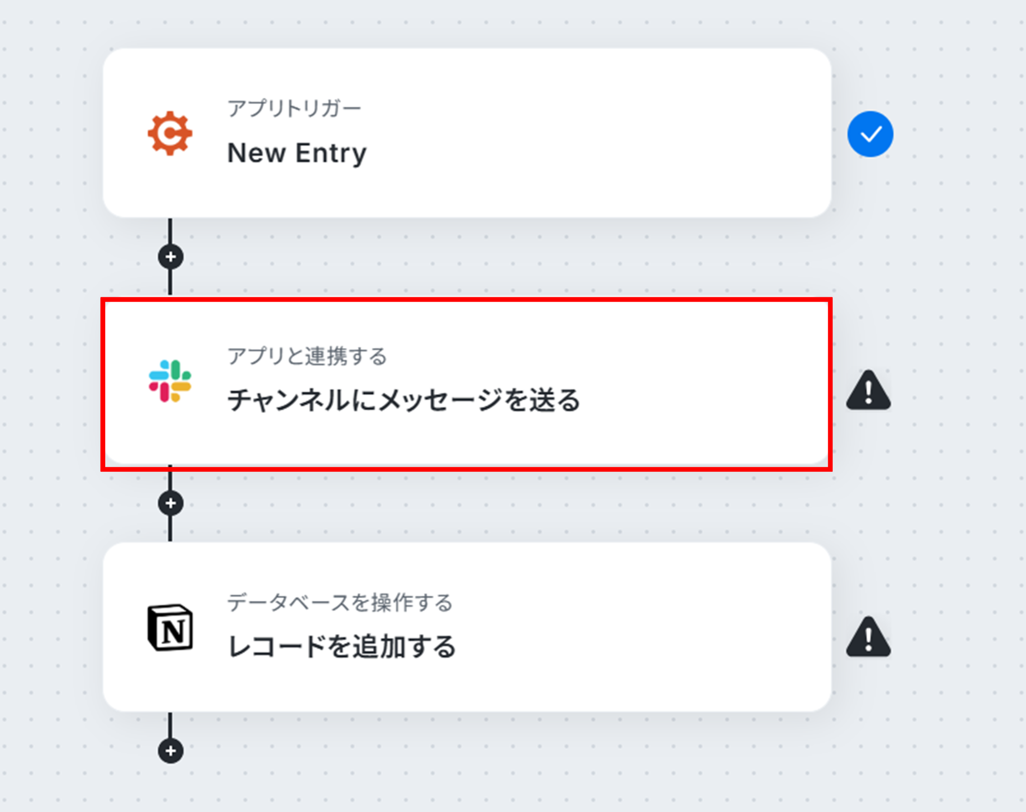 - 次に、オペレーションでSlackの「チャンネルにメッセージを送る」アクションを設定し、エントリーがあった旨を関係者に通知します。