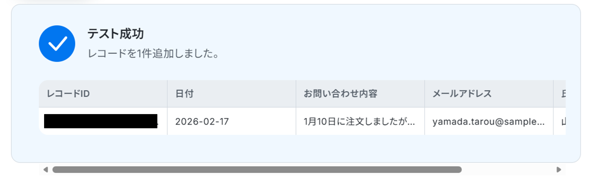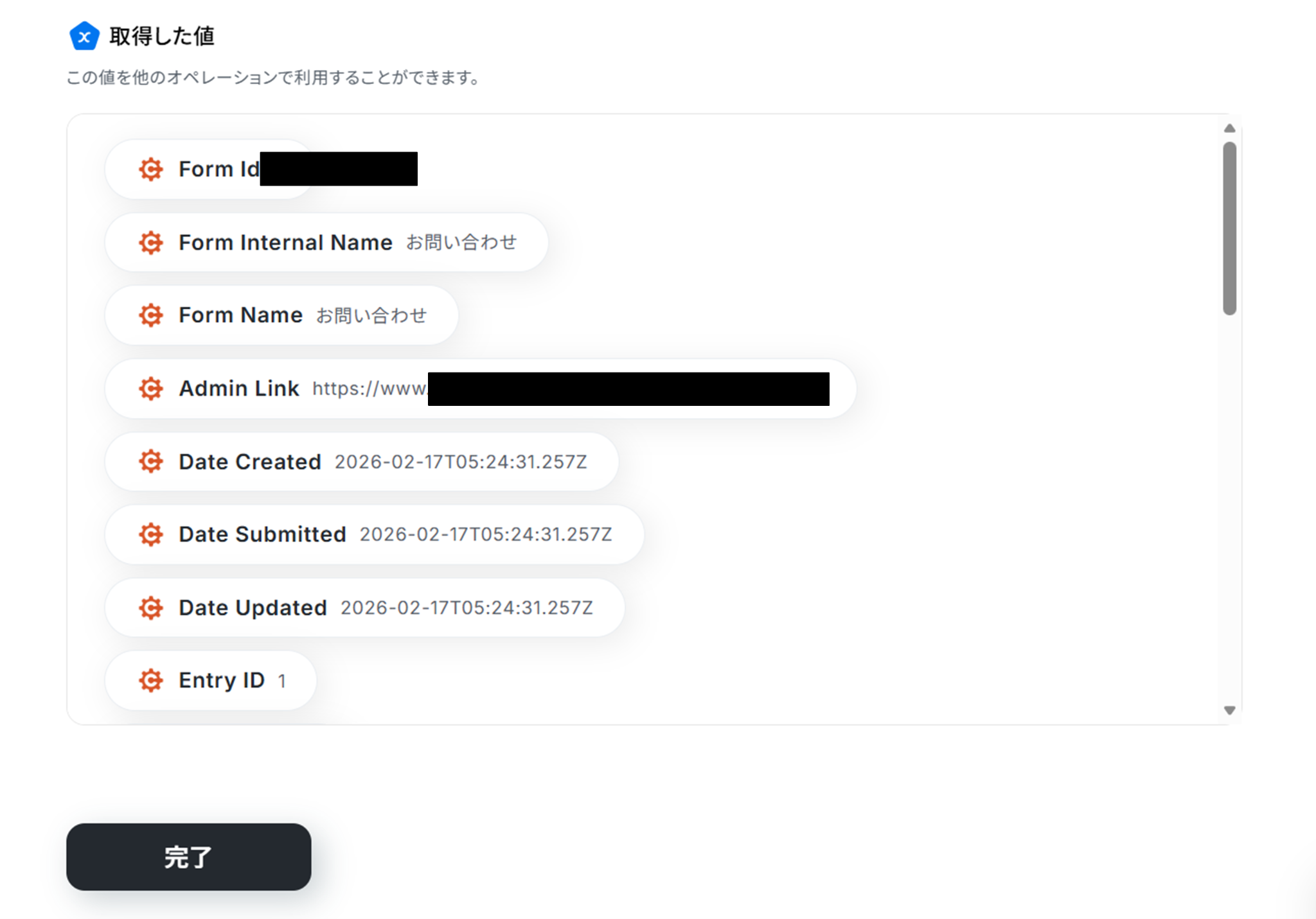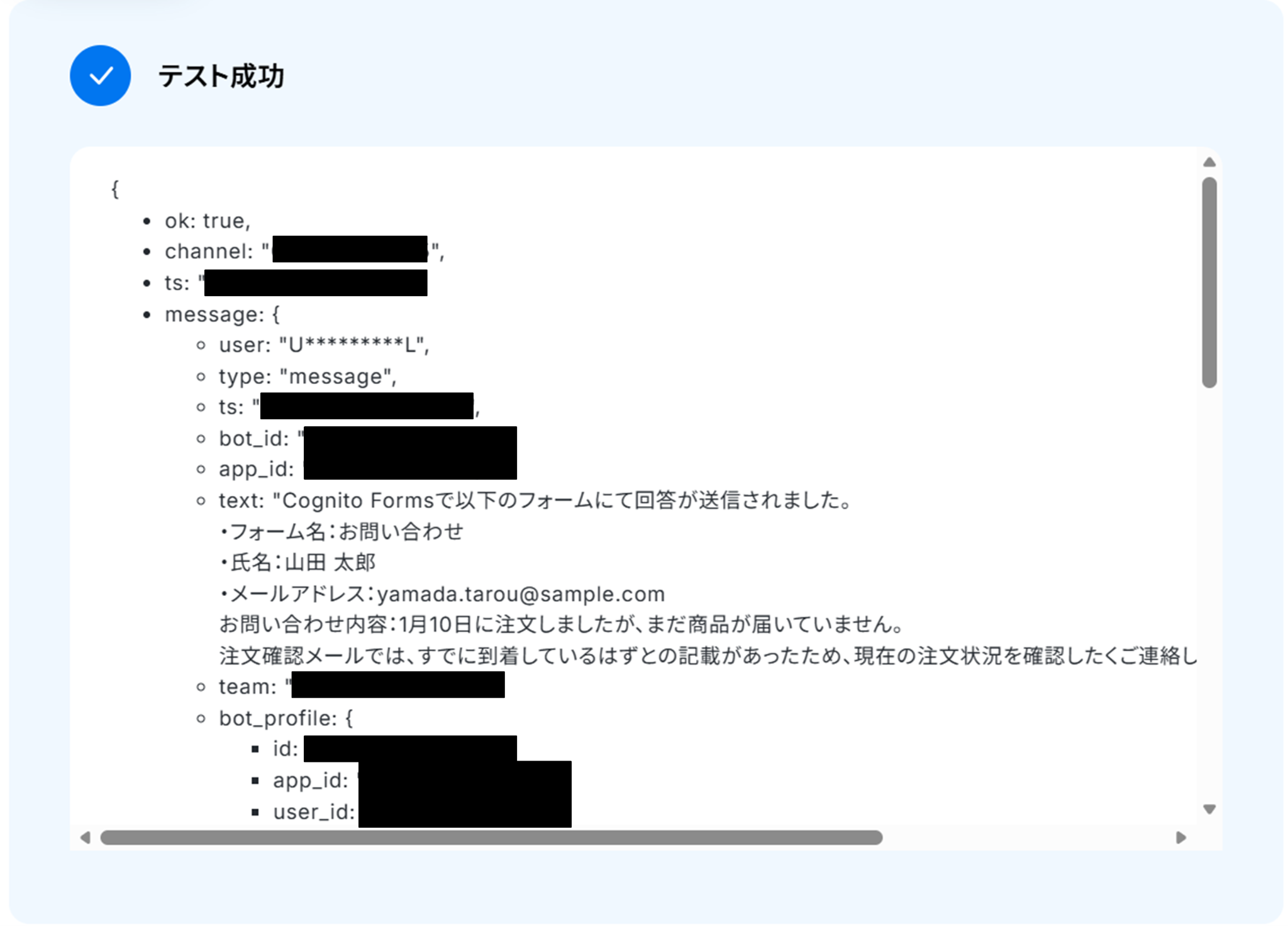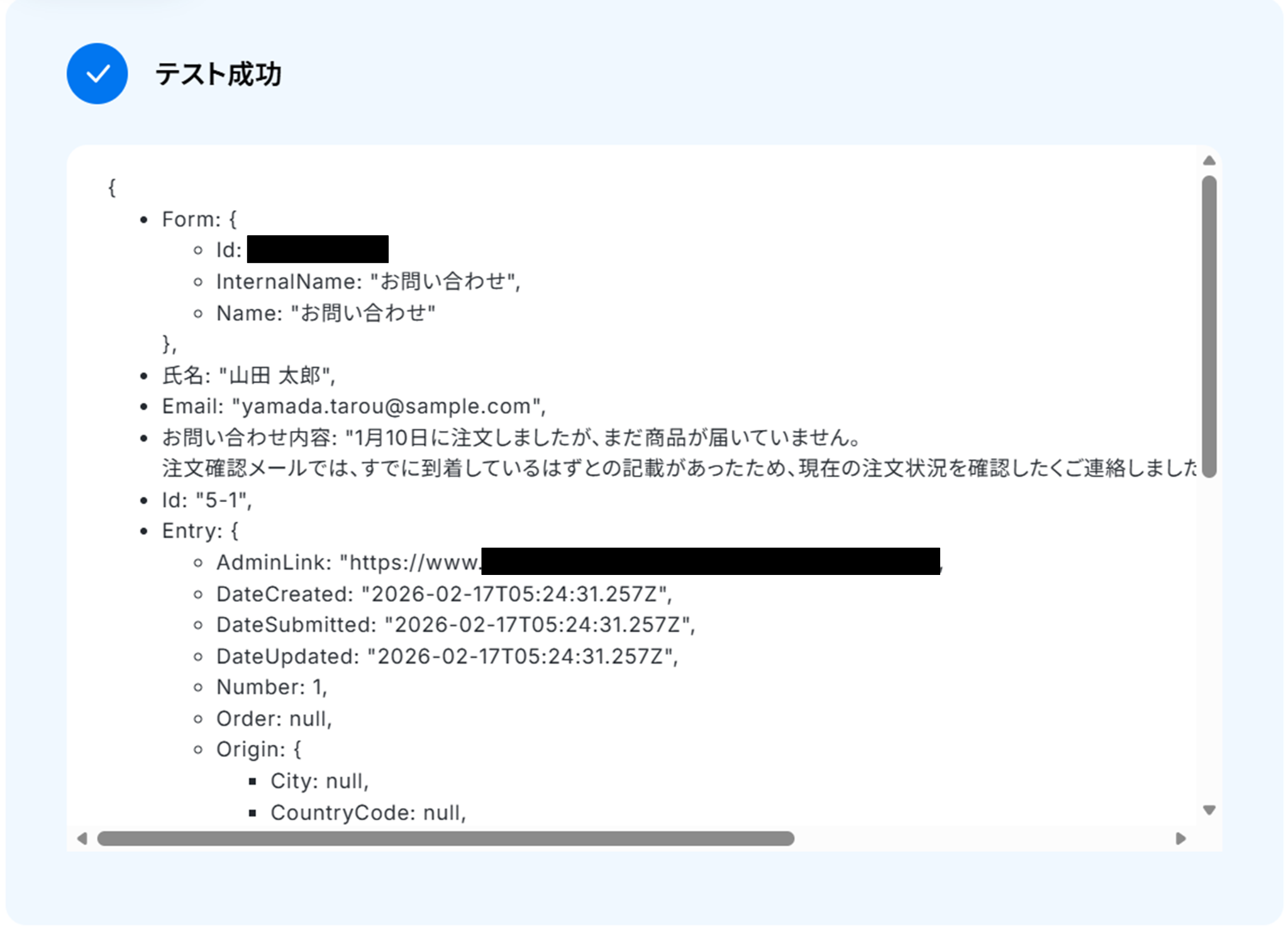 テストに成功すると、取得した値にCognito Formsの情報が反映されます。