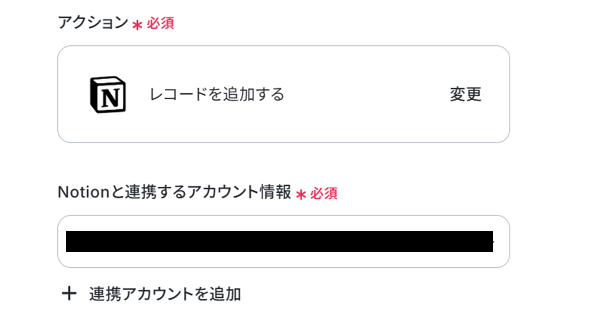 (2)「データベースの連携」画面から、Notionと連携するアカウント情報に誤りがないかを確認し、アクションは「レコードを追加する」のまま下へ進みます。
