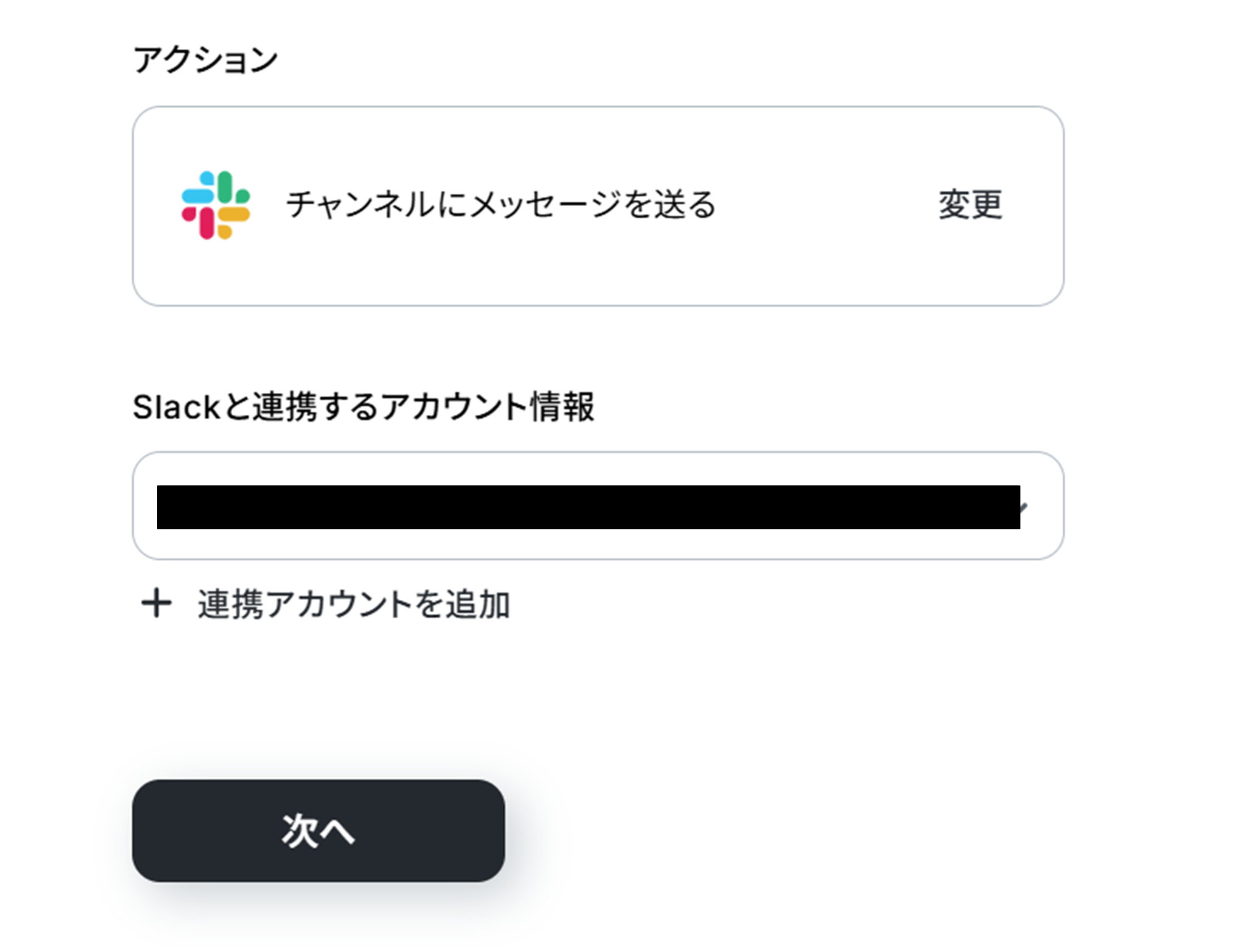 (2)「連携アカウントとアクションを選択」画面から、Slackと連携するアカウント情報に誤りがないかを確認し、アクションは「チャンネルにメッセージを送る」のままで「次へ」をクリックしましょう。