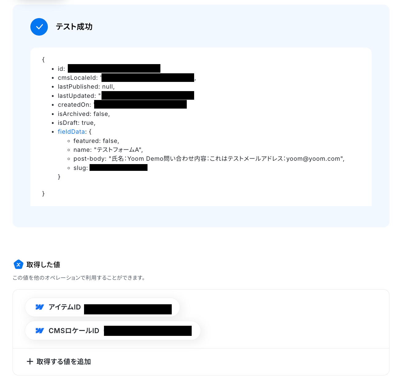 テスト成功という表示がされたら、Webflowのコレクションにアイテムが作成されています。