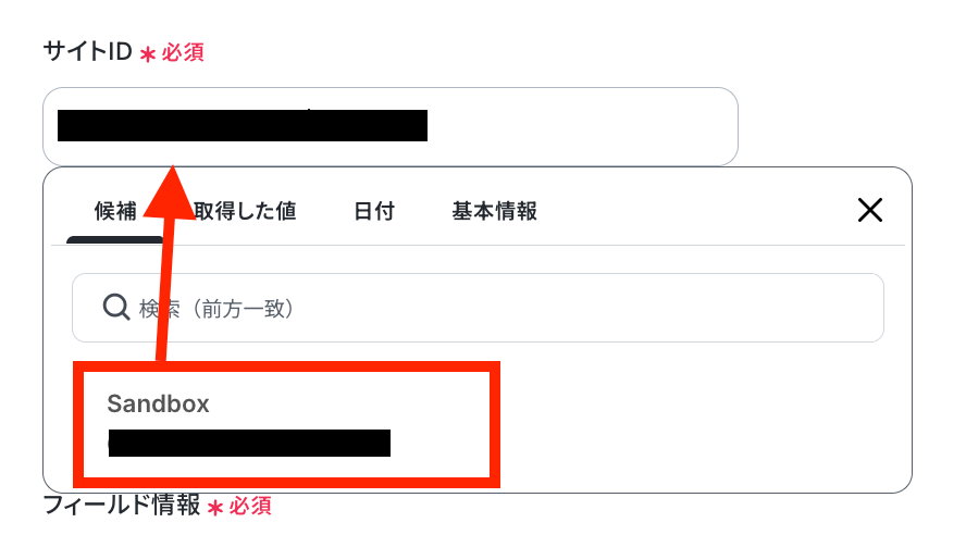 表示された候補の中から対象のサイトIDを選択します。