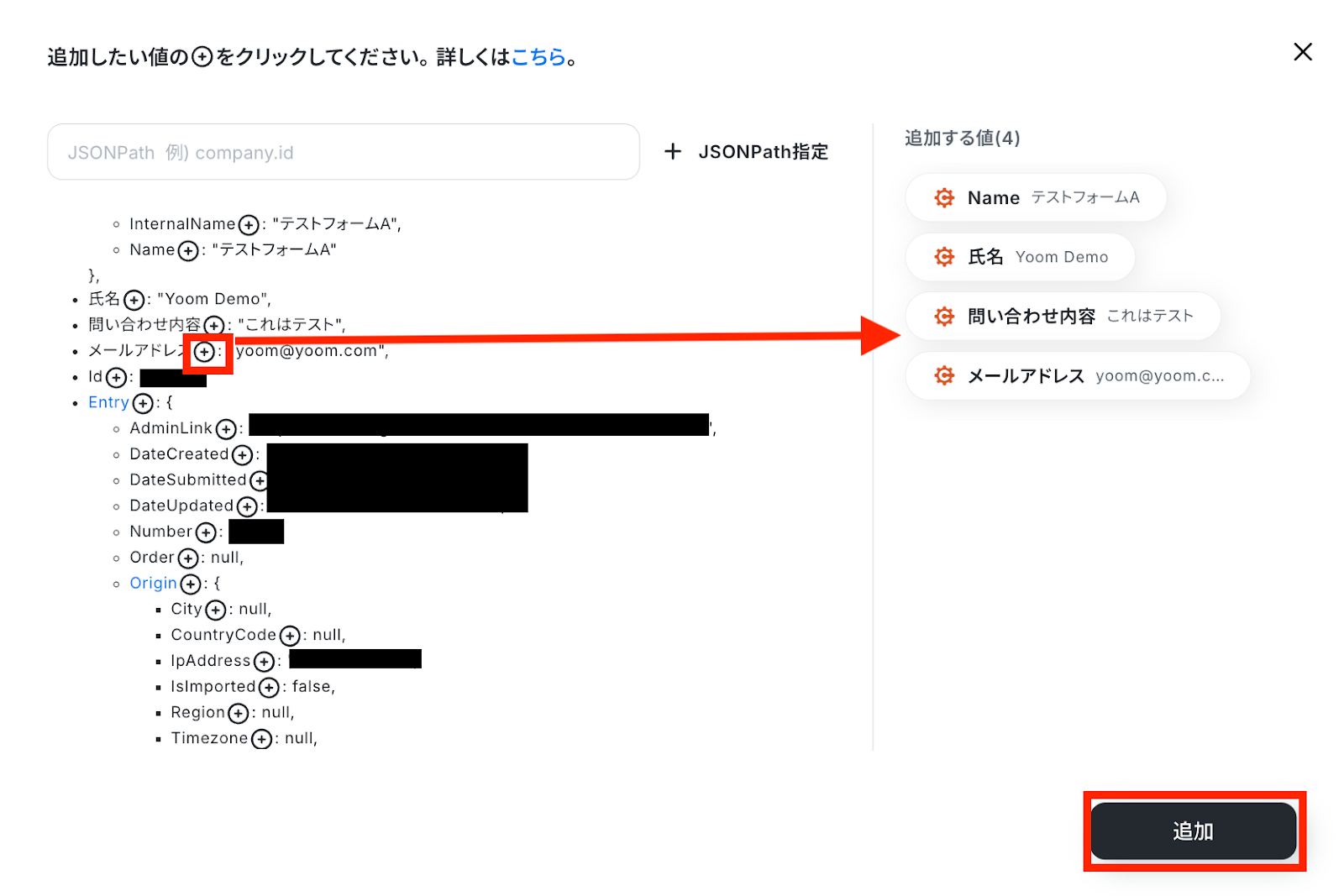 追加したい項目の右にあるプラスマークをクリックして追加する値を選択し、「追加」ボタンを押します。