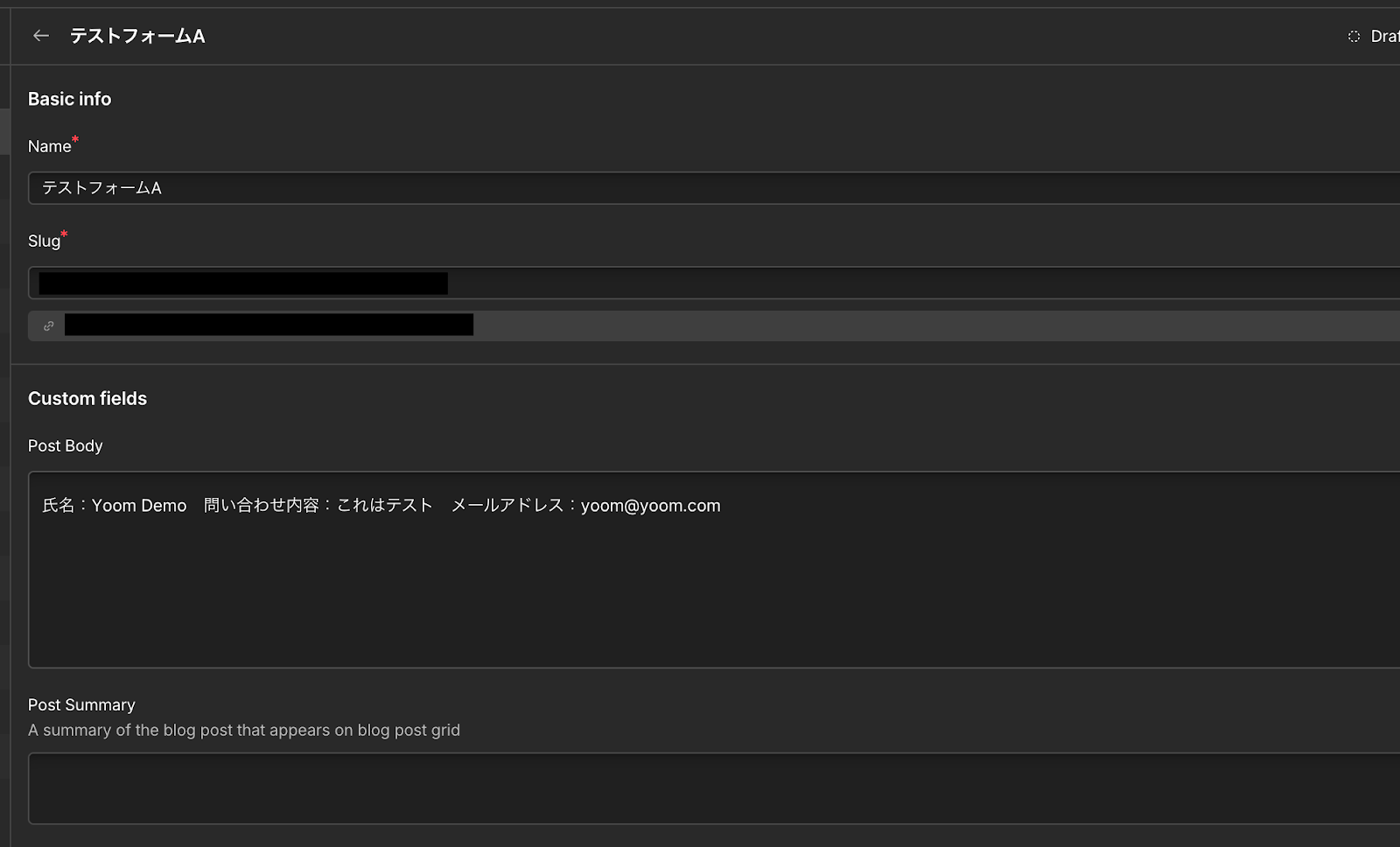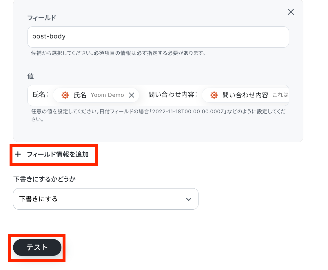 他のフィールド情報も任意で追加していき、完了したら、テストを実行しましょう!