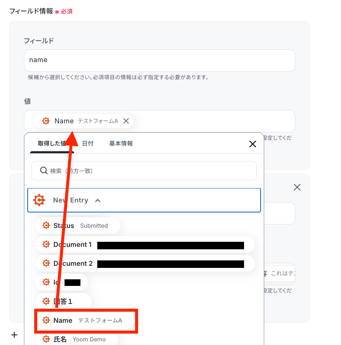 フィールド情報を設定します。フィールドを選択して、取得した値を選択しましょう。