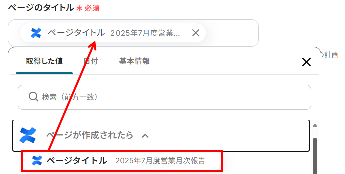 ページのタイトルも、入力欄をクリックすると「取得した値」が表示されるので選択してください。