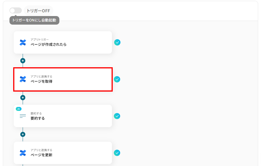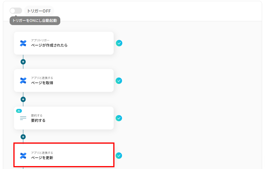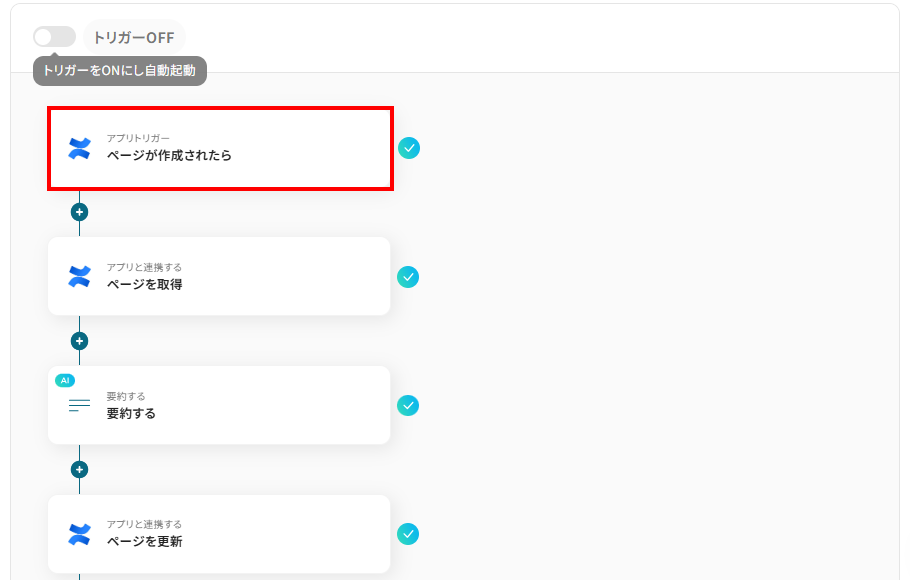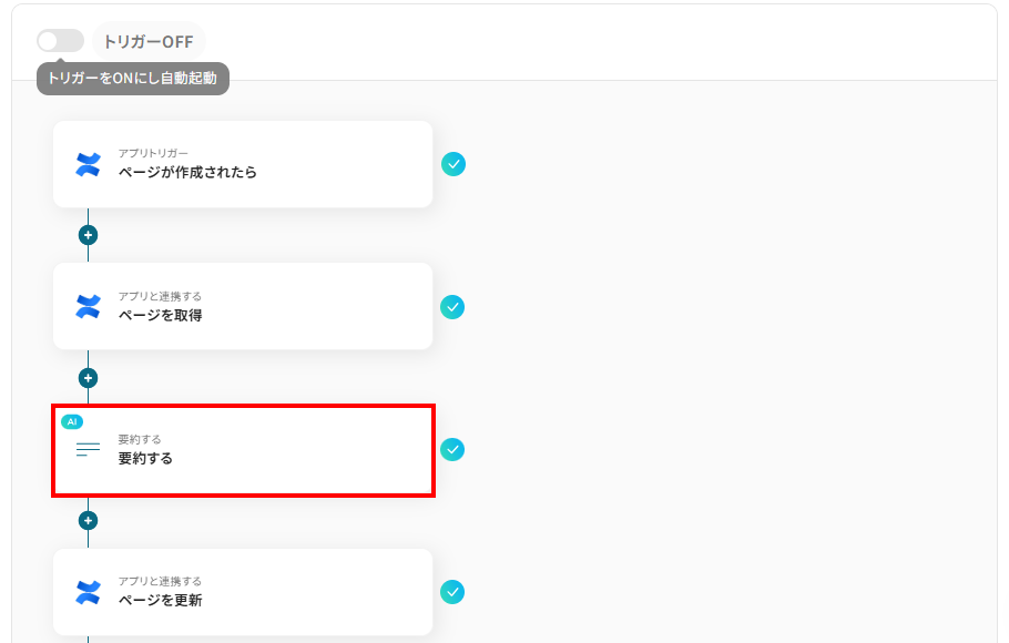 このワークフローは、Confluenceで新しいページが作成されると、AIが自動で本文を要約しページを更新します。