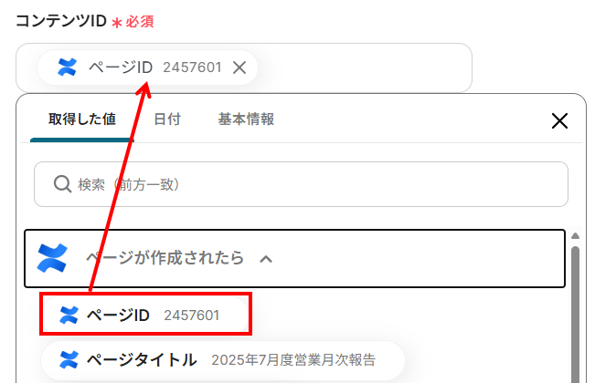 コンテンツIDは、Confluenceのトリガー設定で取得した値から「ページID」を選択しましょう。
