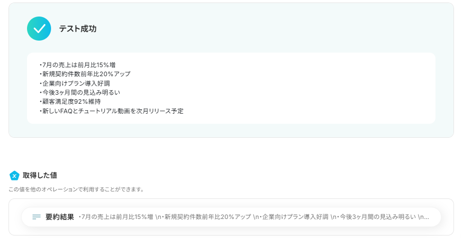 入力が完了したら、「テスト」を実行してみましょう。成功すると、下記のようなアウトプットが表示されます。