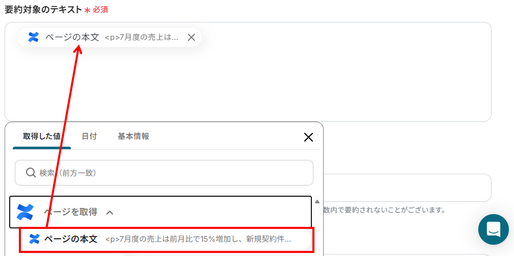 次に、前のステップで取得したConfluenceのページ本文の内容を、AIに要約してもらう設定を行います。