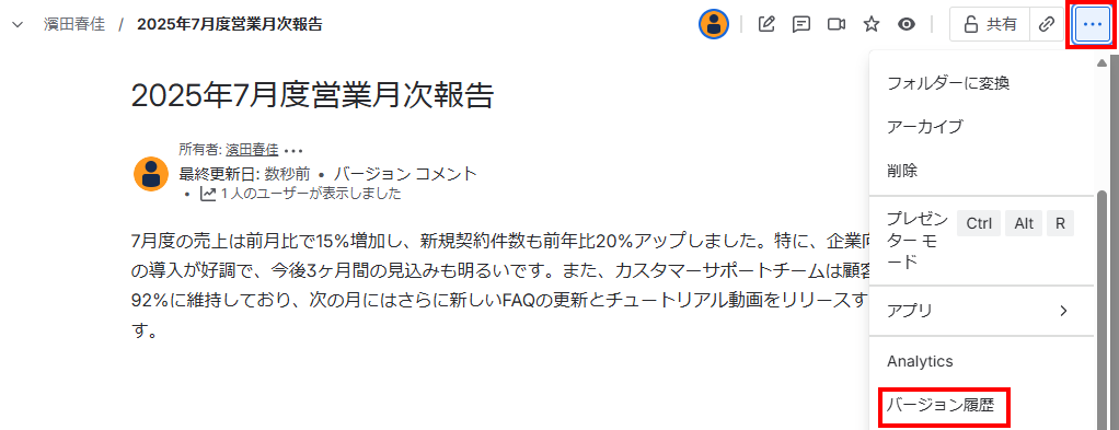 バージョンの確認方法は、更新したいページを開いて右上の「・・・」を選択し「バージョン履歴」をクリックします。