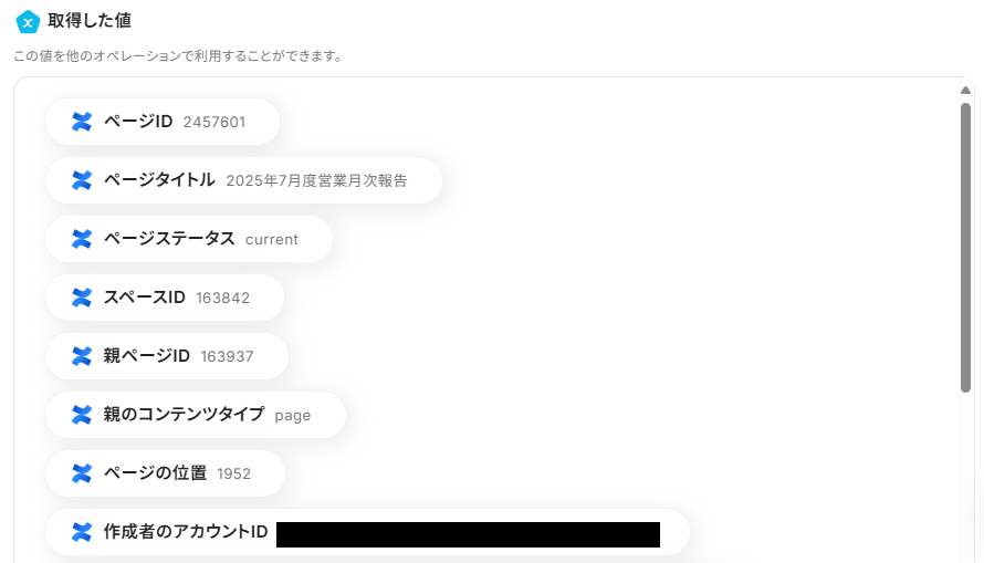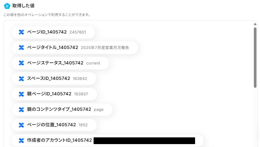 成功すると、「取得した値」にConfluenceの情報が追加されているはずです。
