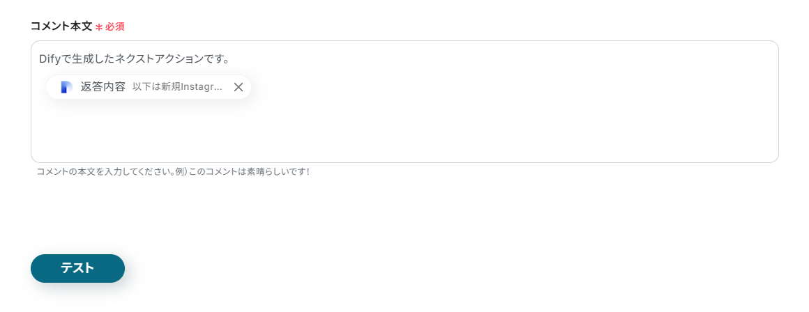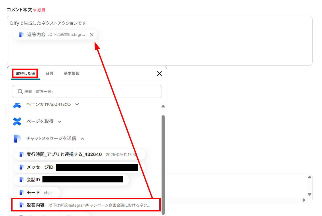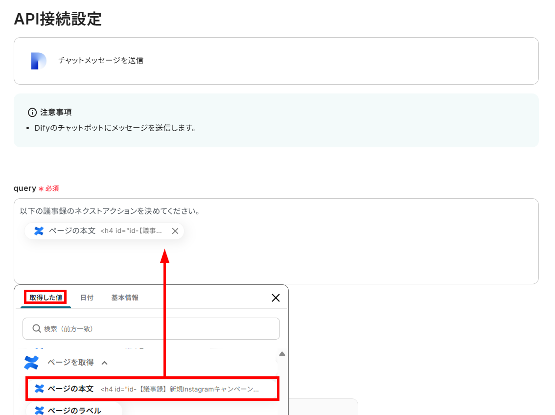 その後、更新する内容を設定することで、Difyの解析内容をページ本文に追加できます。