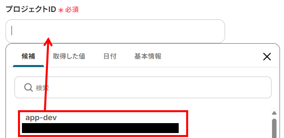 - クラウドID:入力欄を選択すると、候補が表示されるので対象のクラウドIDを選択してください。