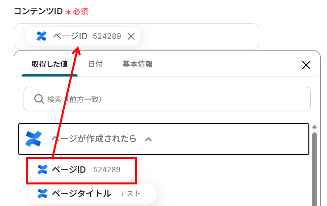 コンテンツIDは、Confluenceのトリガー設定で取得した値から「ページID」を選択しましょう。