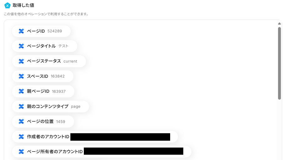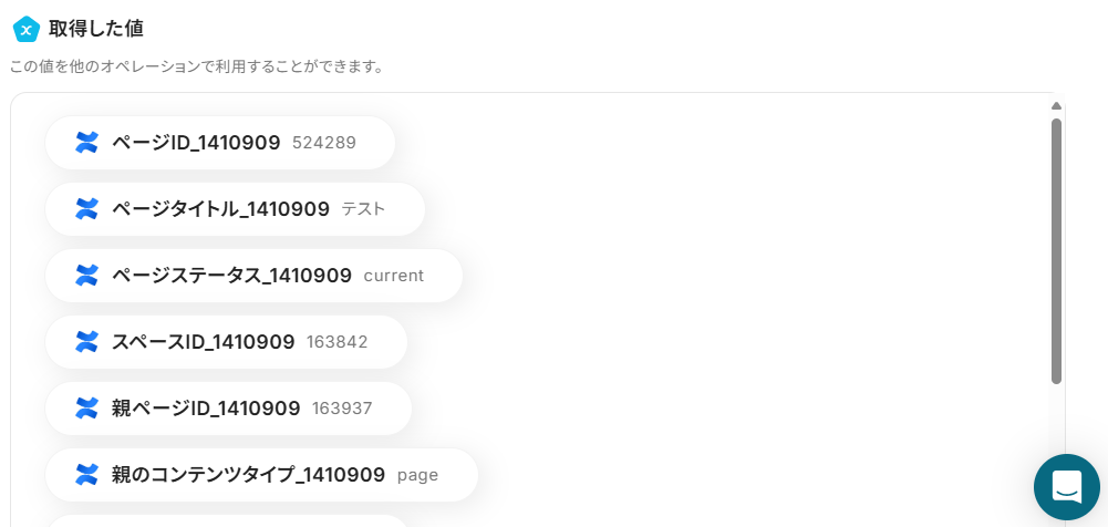 成功すると、「取得した値」にConfluenceの情報が追加されているはずです。