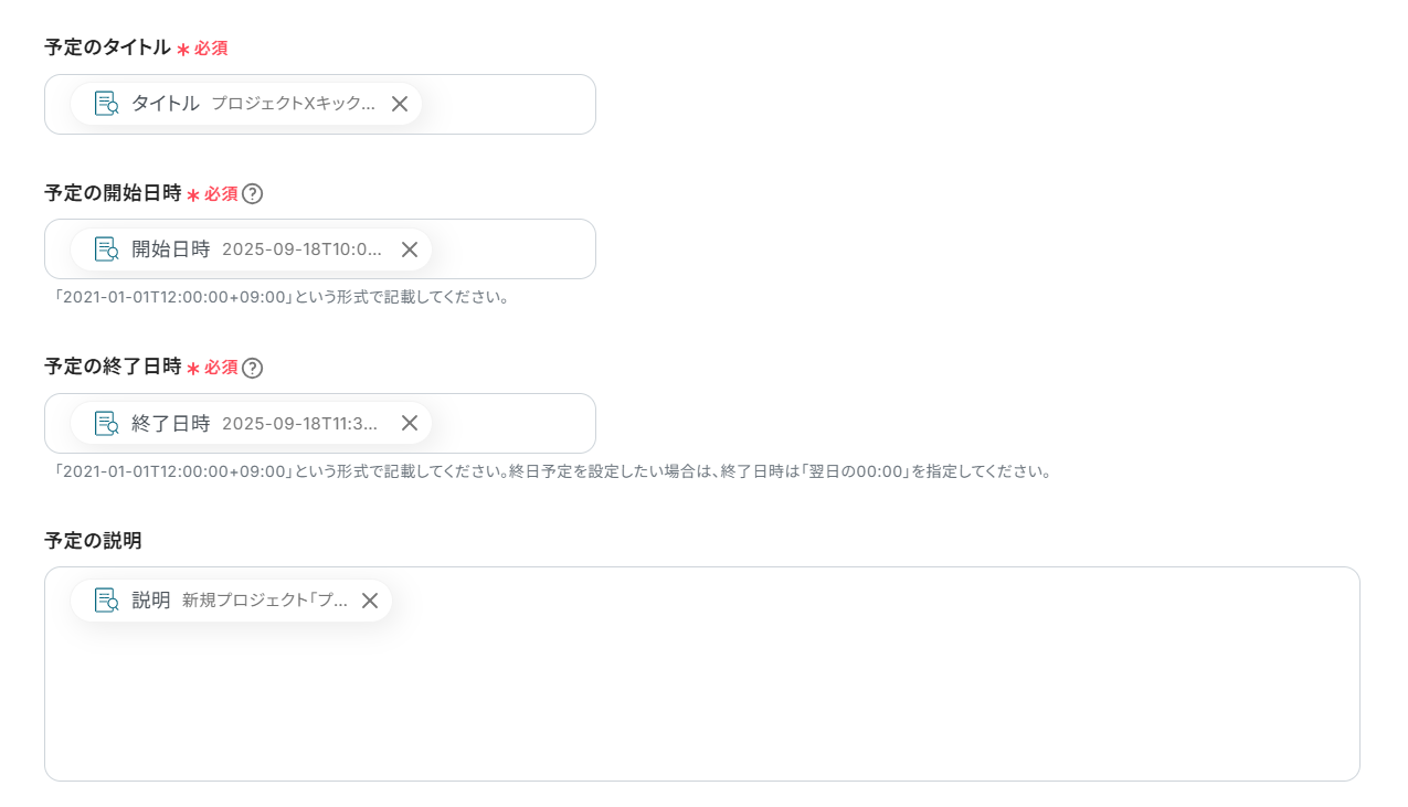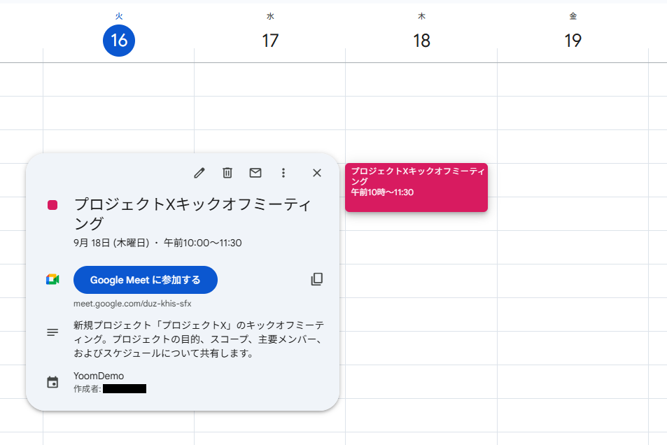 予定作成をトリガーに、ドキュメントに自動で追加したり、会議を作成してURLを予定に反映したりできます。