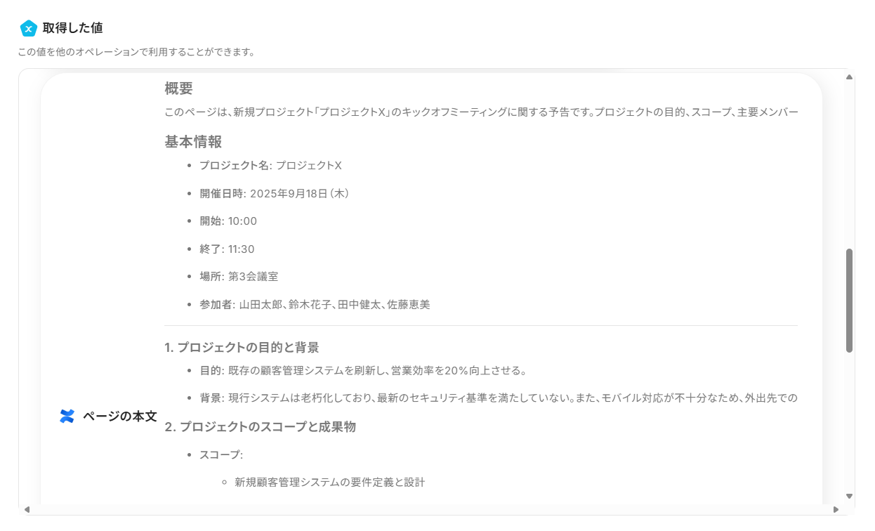 Confluenceで作成された長文のページ内容をAIが自動で要約し、その要約文をGoogleカレンダーの予定の説明欄に記載することができます。