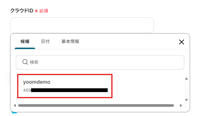 入力欄をクリックすると、連携しているアカウントから候補が表示されますので、対象となるクラウドIDを選択してください。