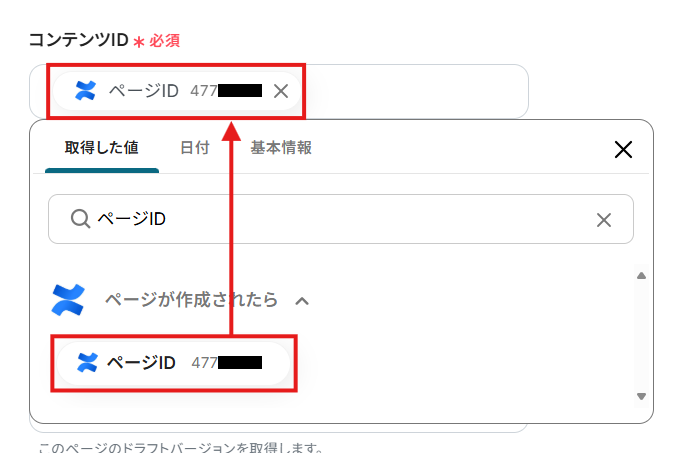- テストに成功すると、「取得した値」に最新のページのID情報などが追加されます。