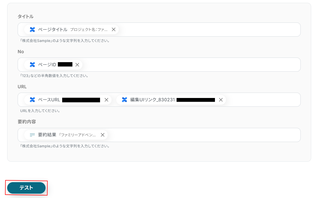 以下のように全ての項目を設定できたら「テスト」をクリックしてください。